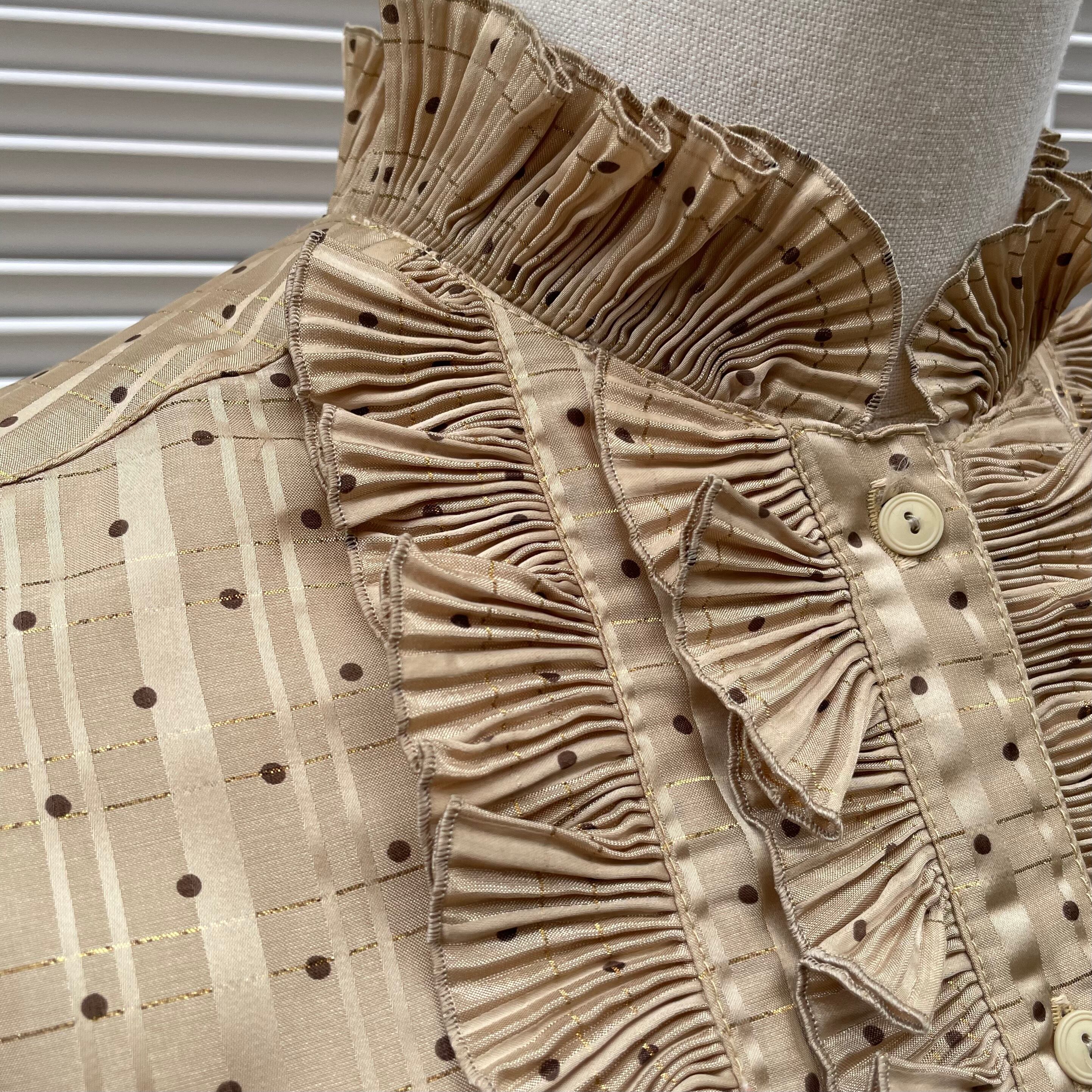 plaid × dot pleated frill blouse〈レトロ古着 チェック × ドット プリーツフリルブラウス 茶色 ブラウン日本製〉