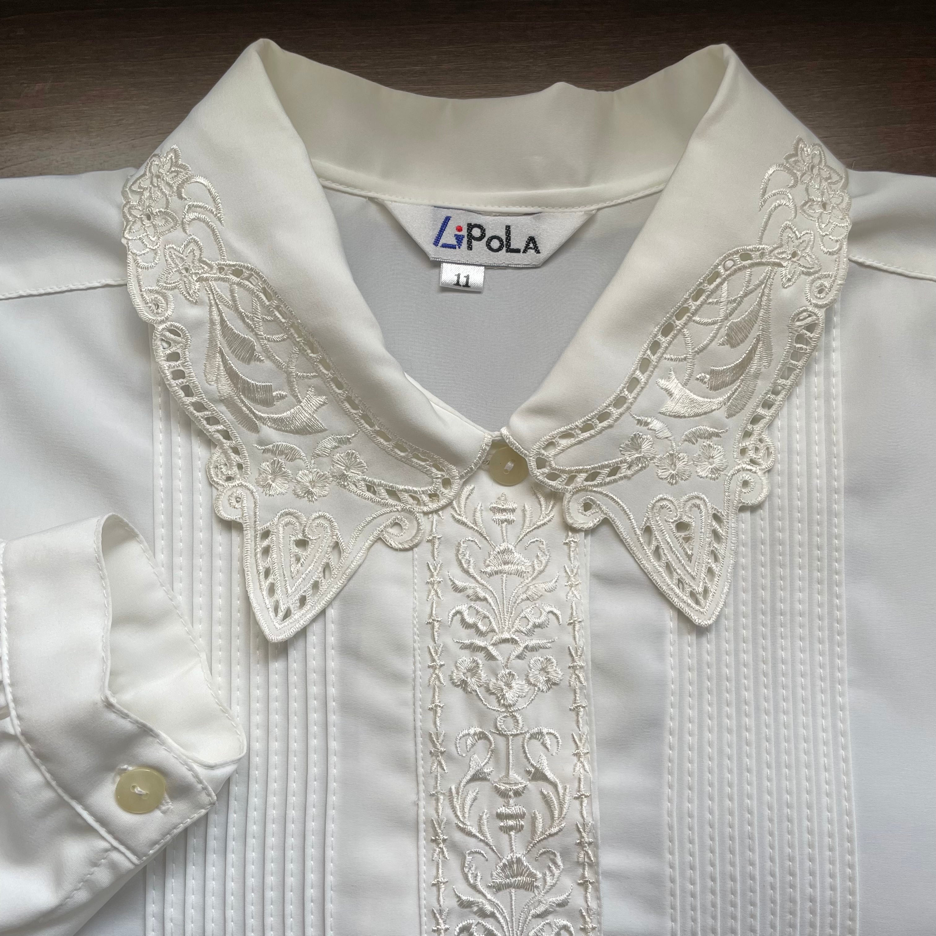 flower × damask embroidery fly front blouse 〈レトロ古着 フラワー × ダマスク 刺繍 比翼仕立てブラウス 白 ホワイト〉