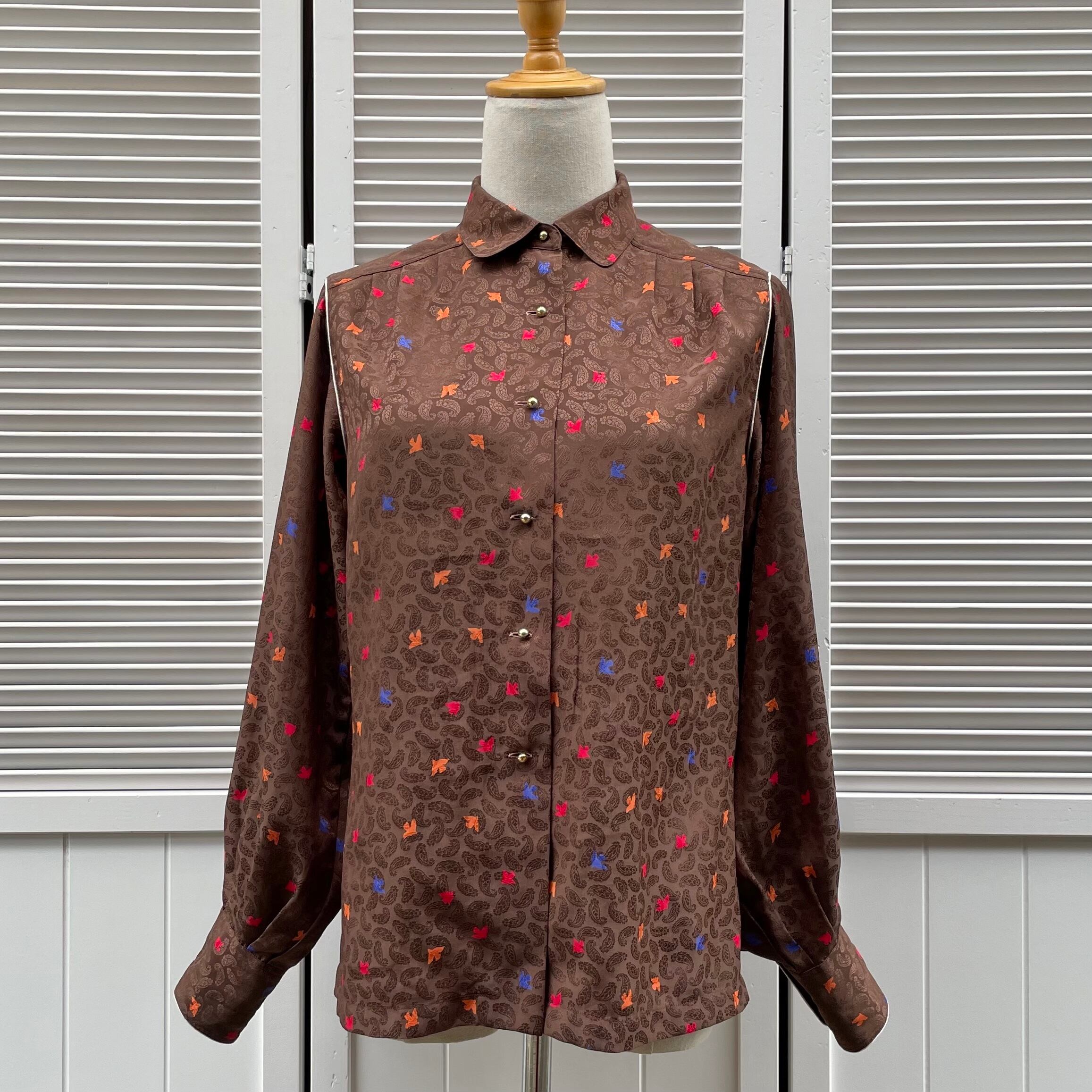 NINA RICCI paisley & bird textile blouse 〈レトロ古着 ニナリッチ ペイズリー × バード テキスタイル ブラウス ブラウン 茶色〉