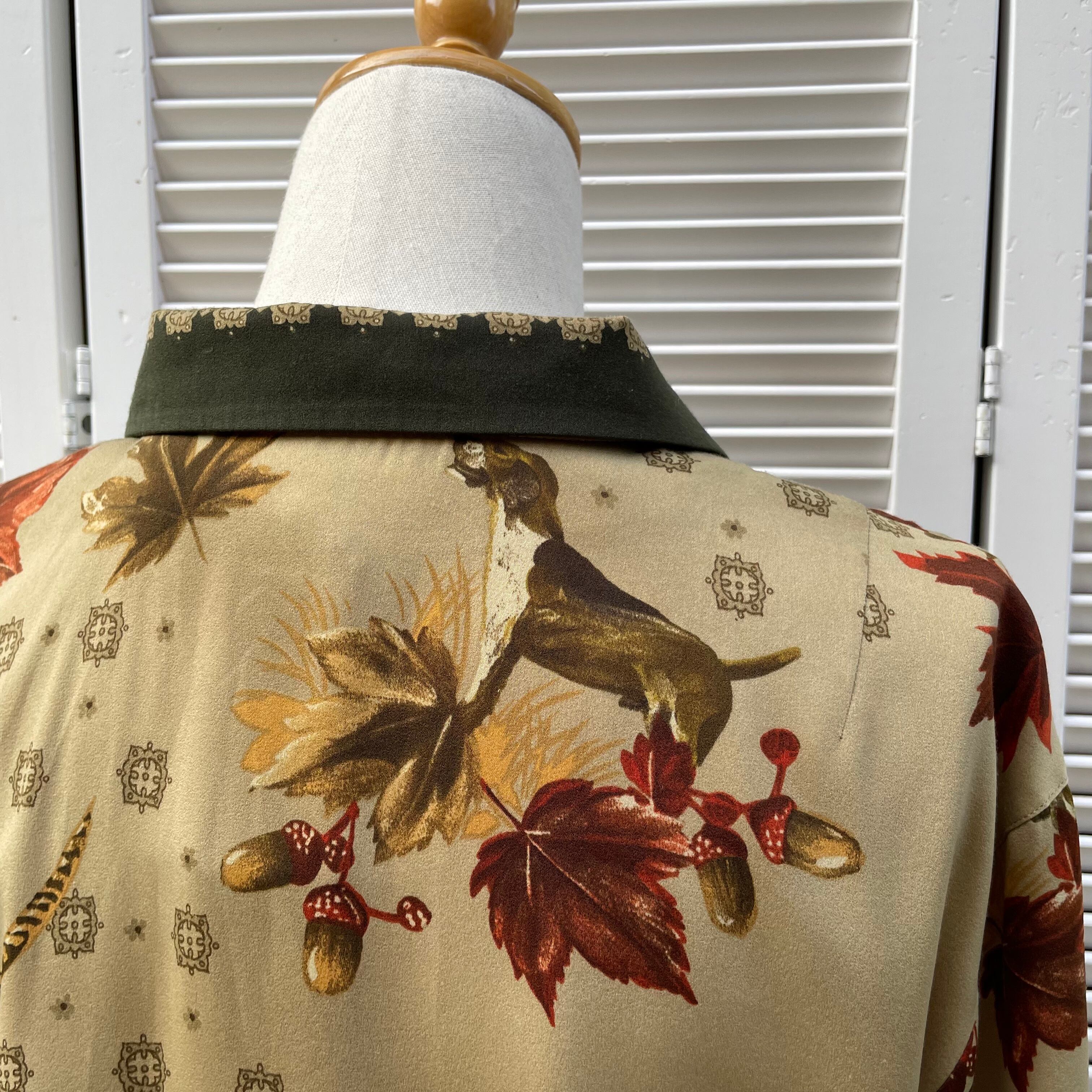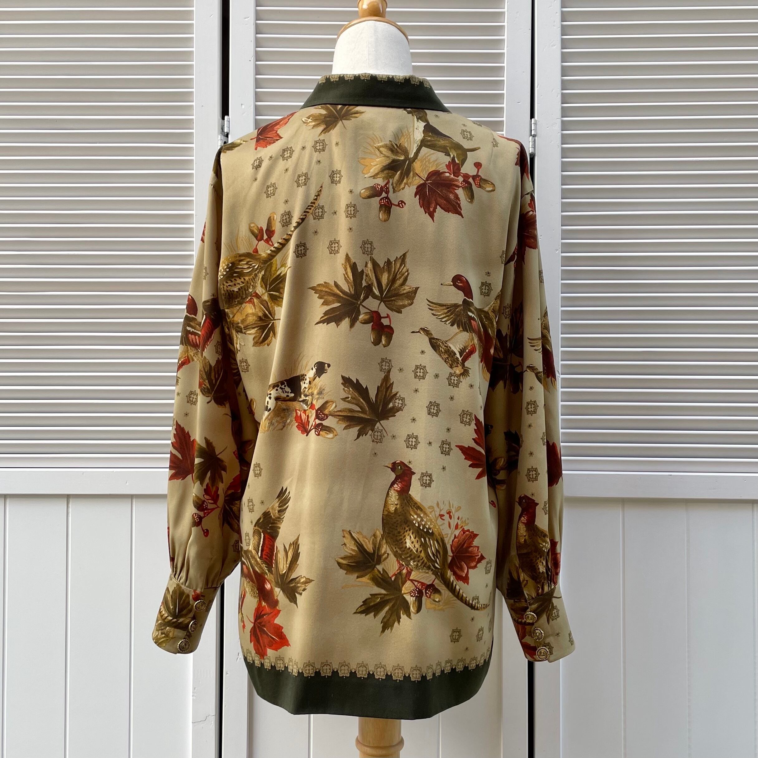 dog & bird motif shirt 〈レトロ古着 ドッグ&バード モチーフ 柄シャツ グリーン カーキ 緑 アニマル 動物 日本製〉