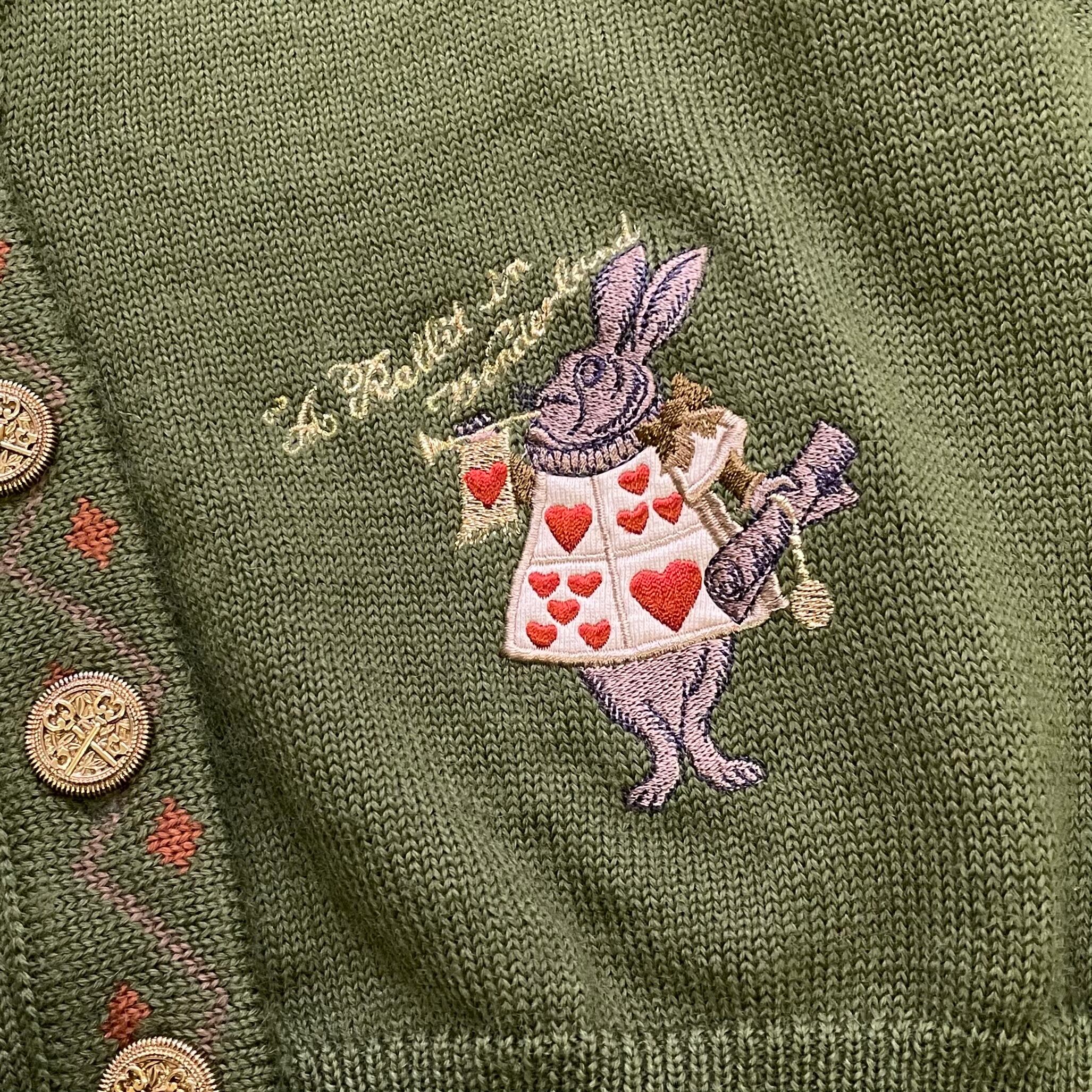 “Alice in Wonderland” White Rabbit cardigan 〈レトロ古着 “不思議の国のアリス” 白うさぎ カーディガン 緑 日本製〉