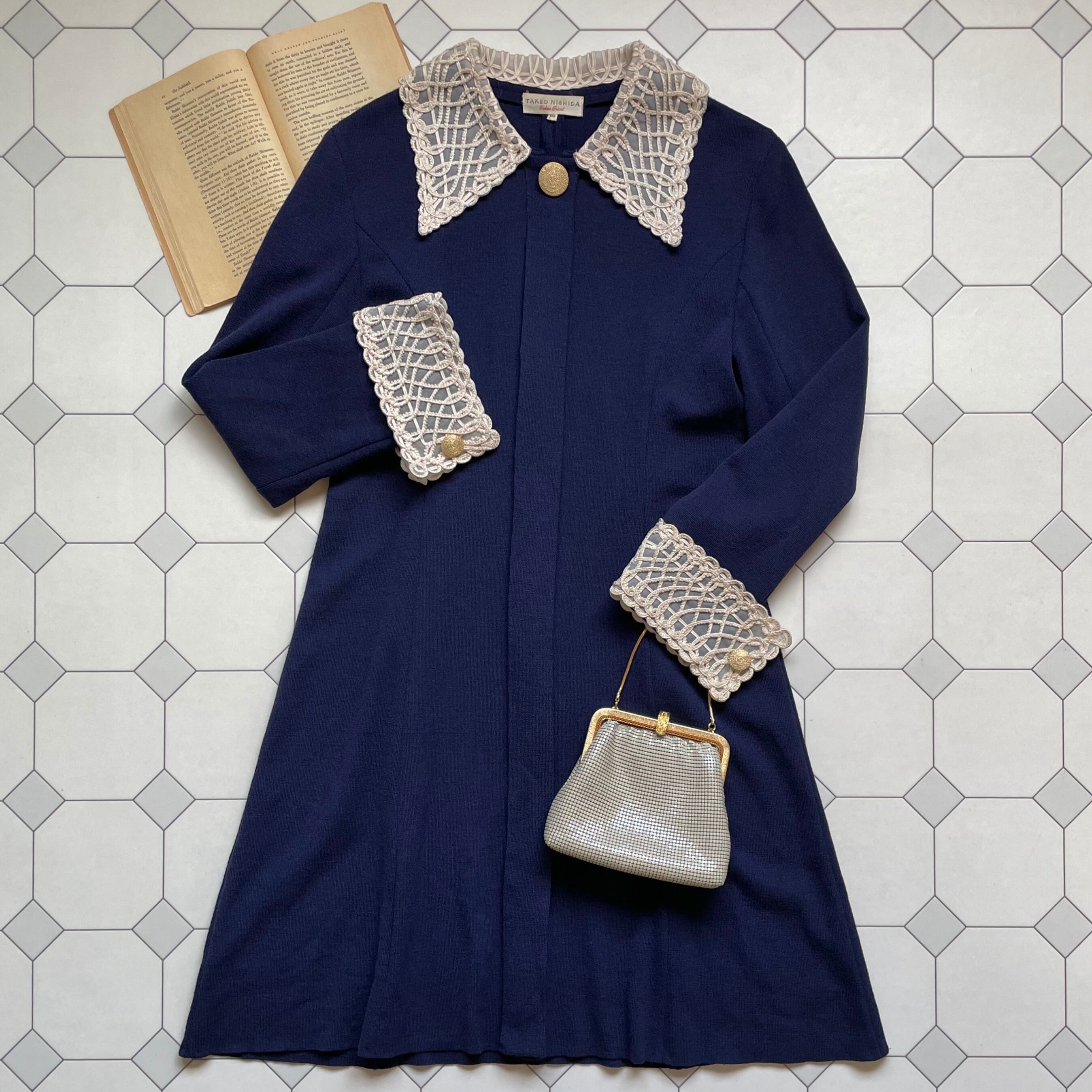 cord embroidered knit dress〈レトロ古着 コード刺繍 デザイン ニットワンピース ドレス ネイビー〉