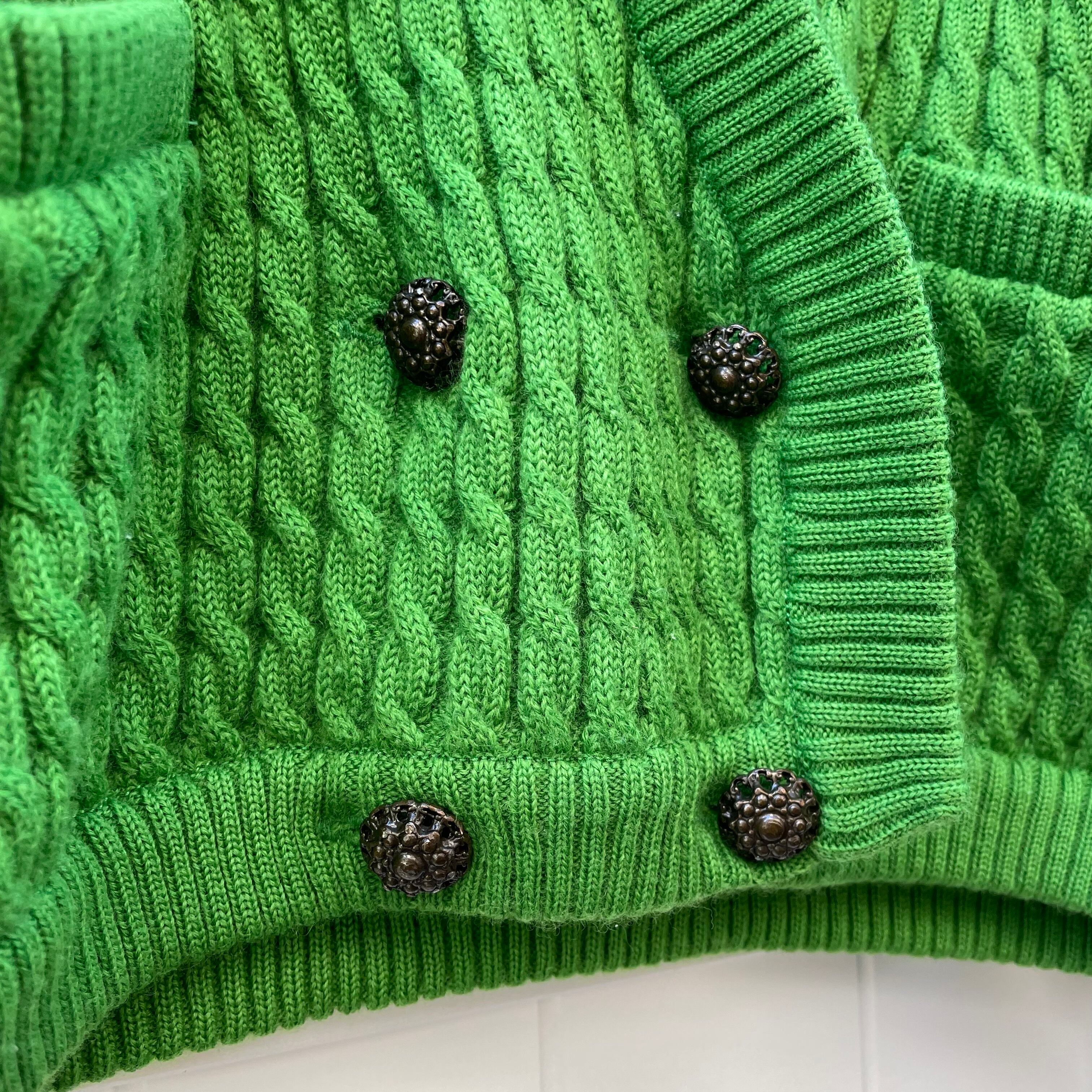 パキッと鮮やかなグリーンが目を引くケーブル編みカーディガン
