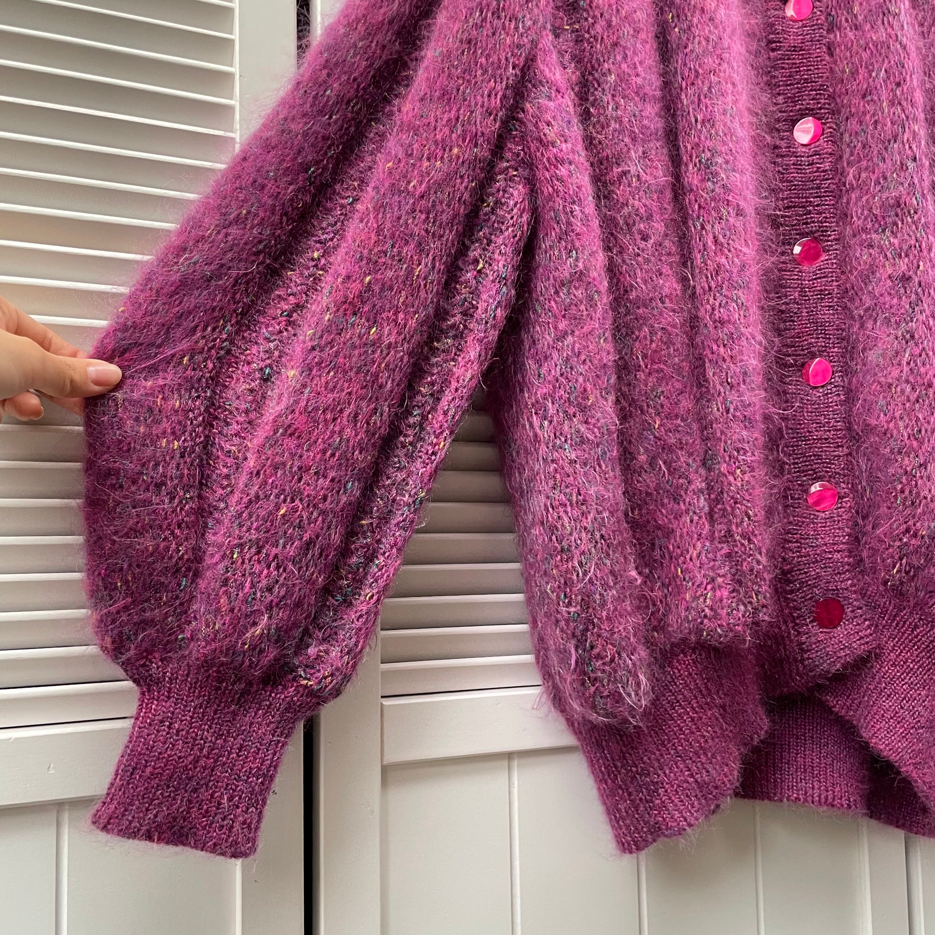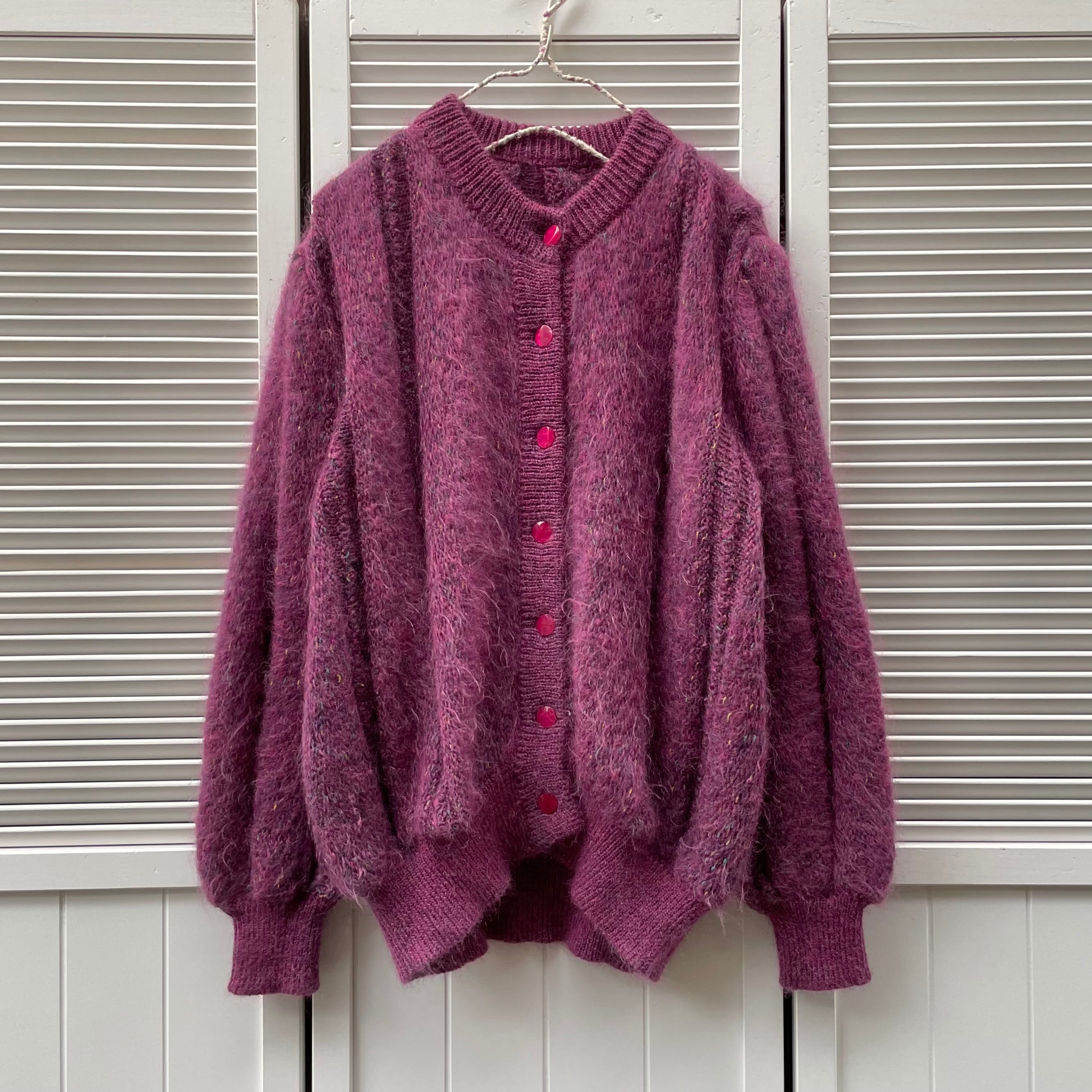 パープルのモヘアにカラフルな糸がミックスされたカーディガン