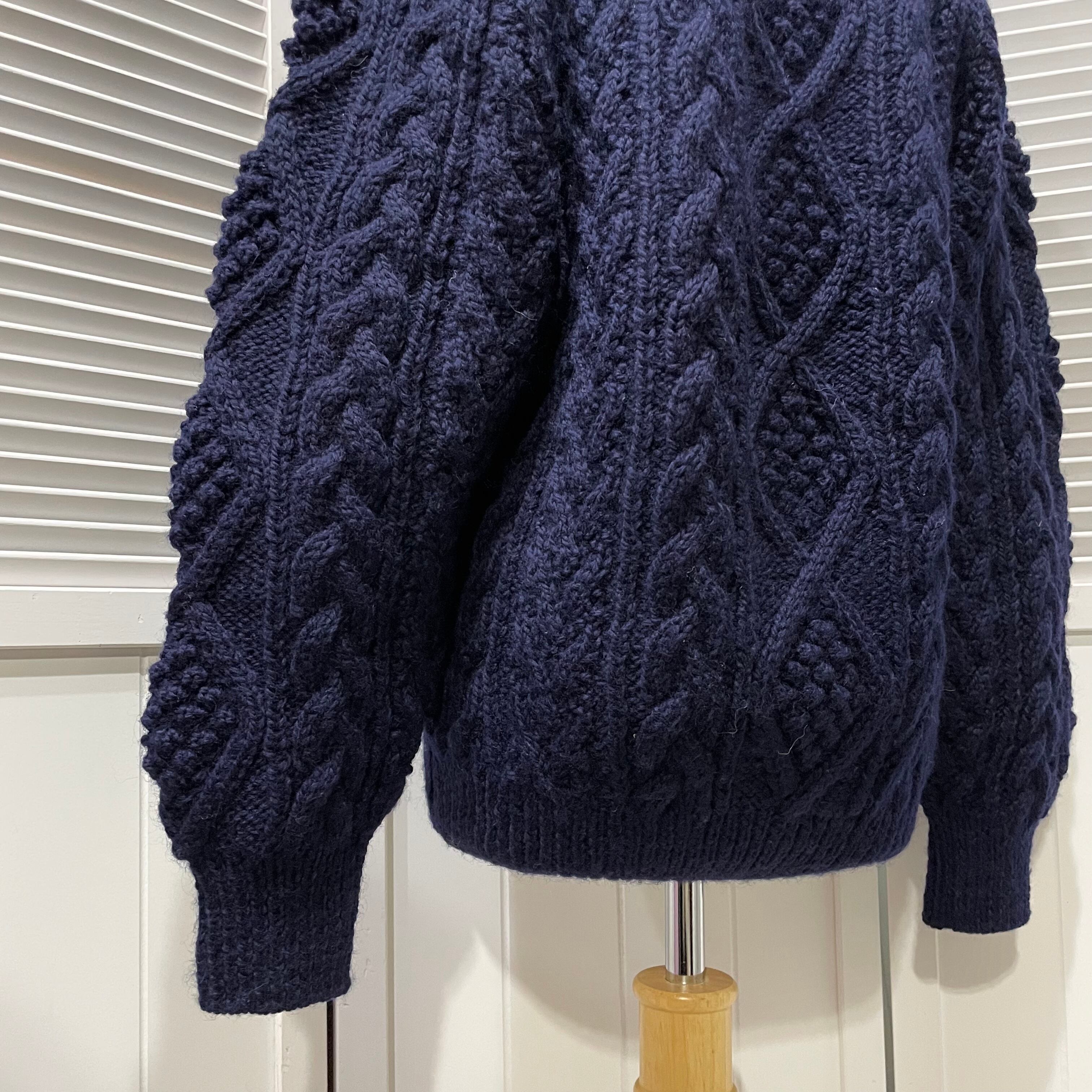 ケーブル編みやぽこぽことした立体的な編み地が愛らしいネイビーのアランニット