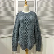 くすみ系の水色にブラウンやホワイトのネップがミックスされたアランニット