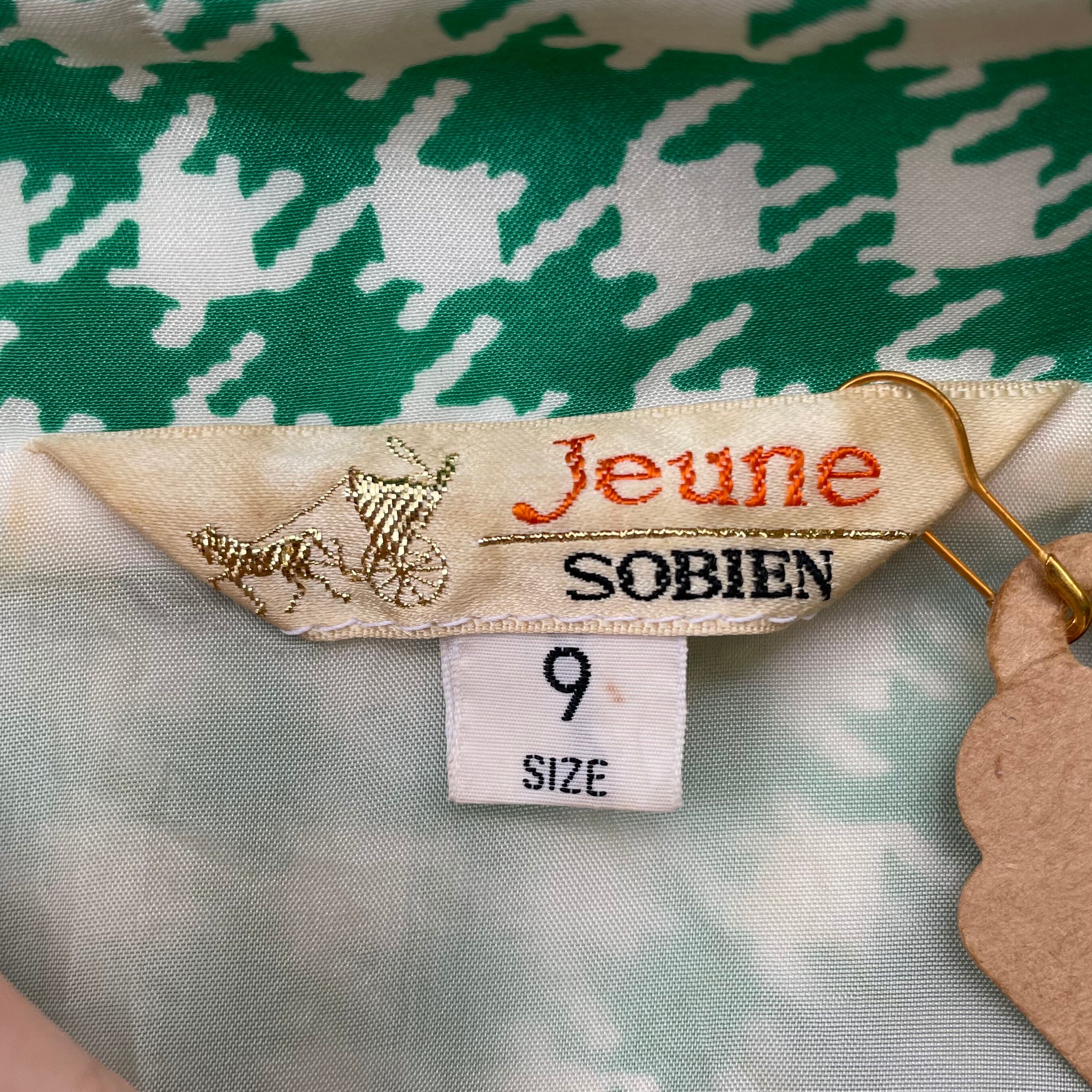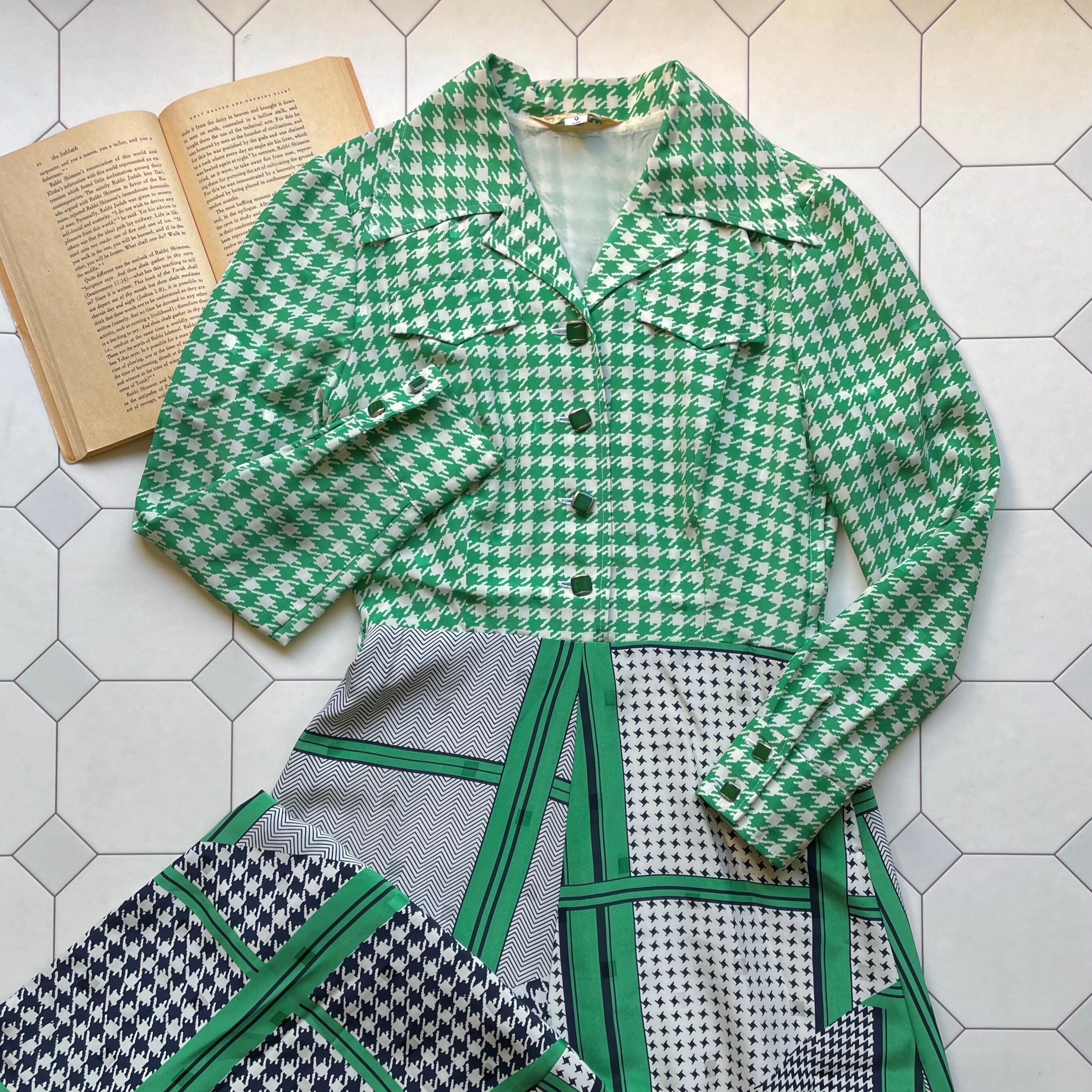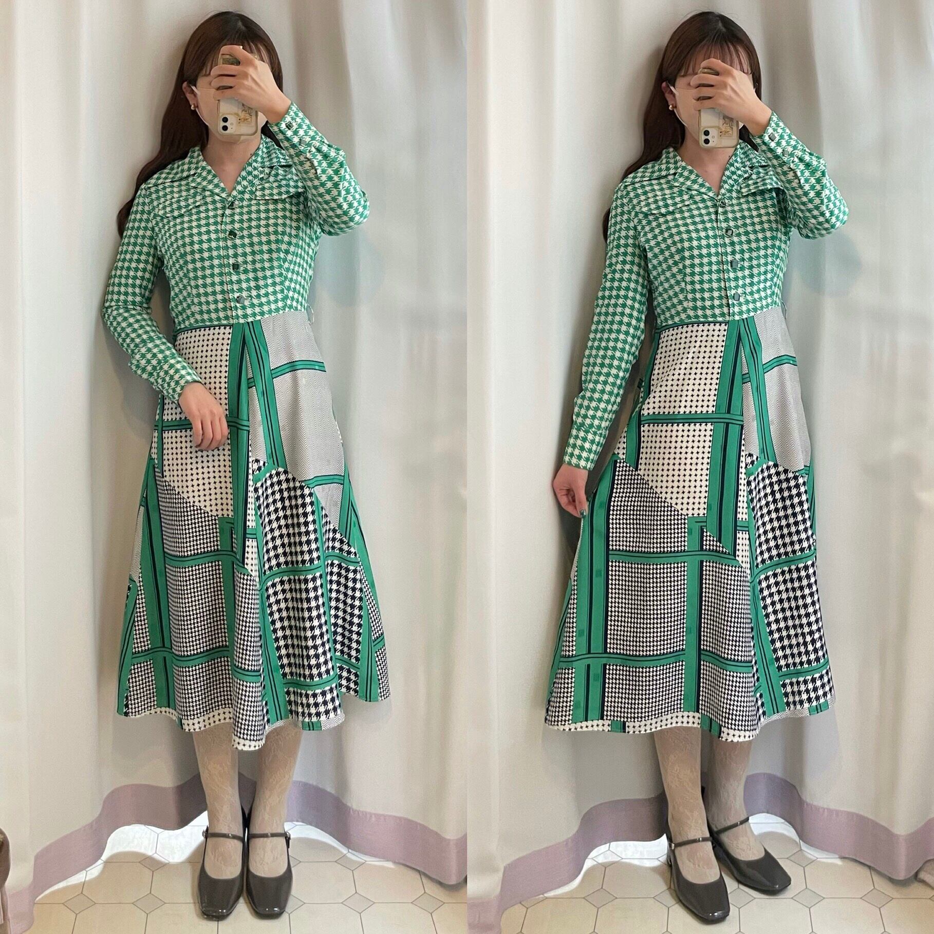mix pattern open collar dress〈レトロ古着 ミックスパターン 開襟ワンピース 緑 チェック〉