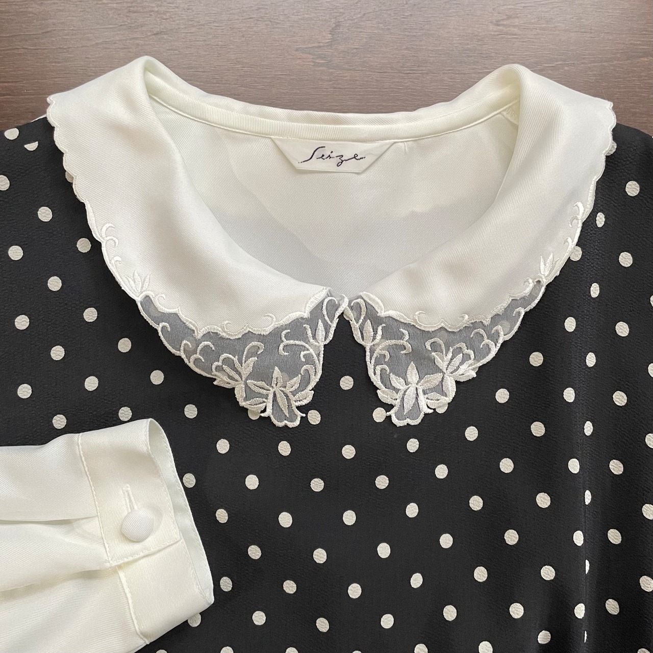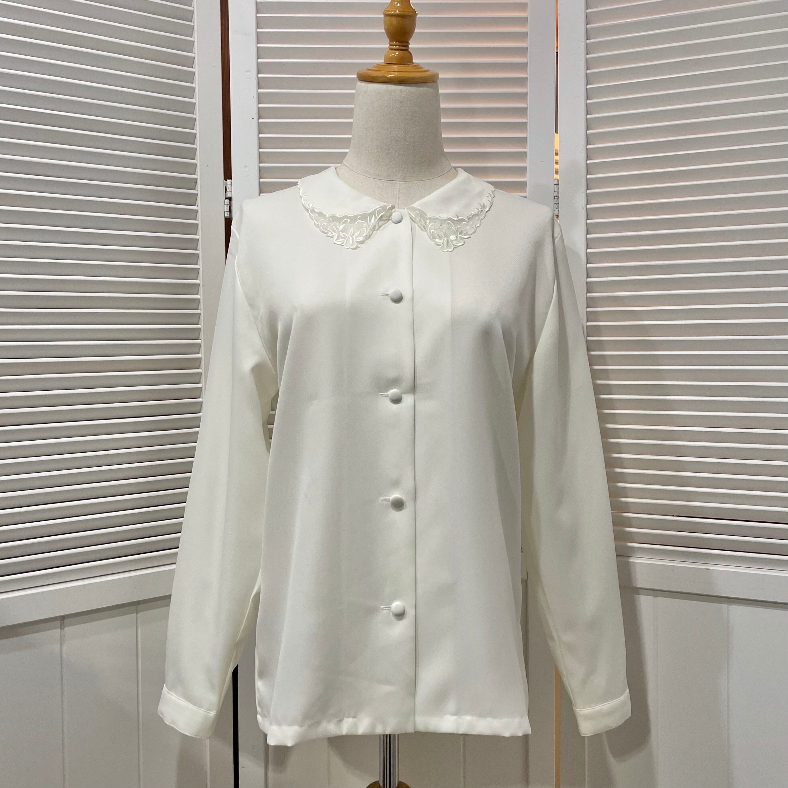 arabesque embroidery sheer collar blouse〈レトロ古着 唐草刺繍 シアー襟 ブラウス 白ブラウス 日本製〉