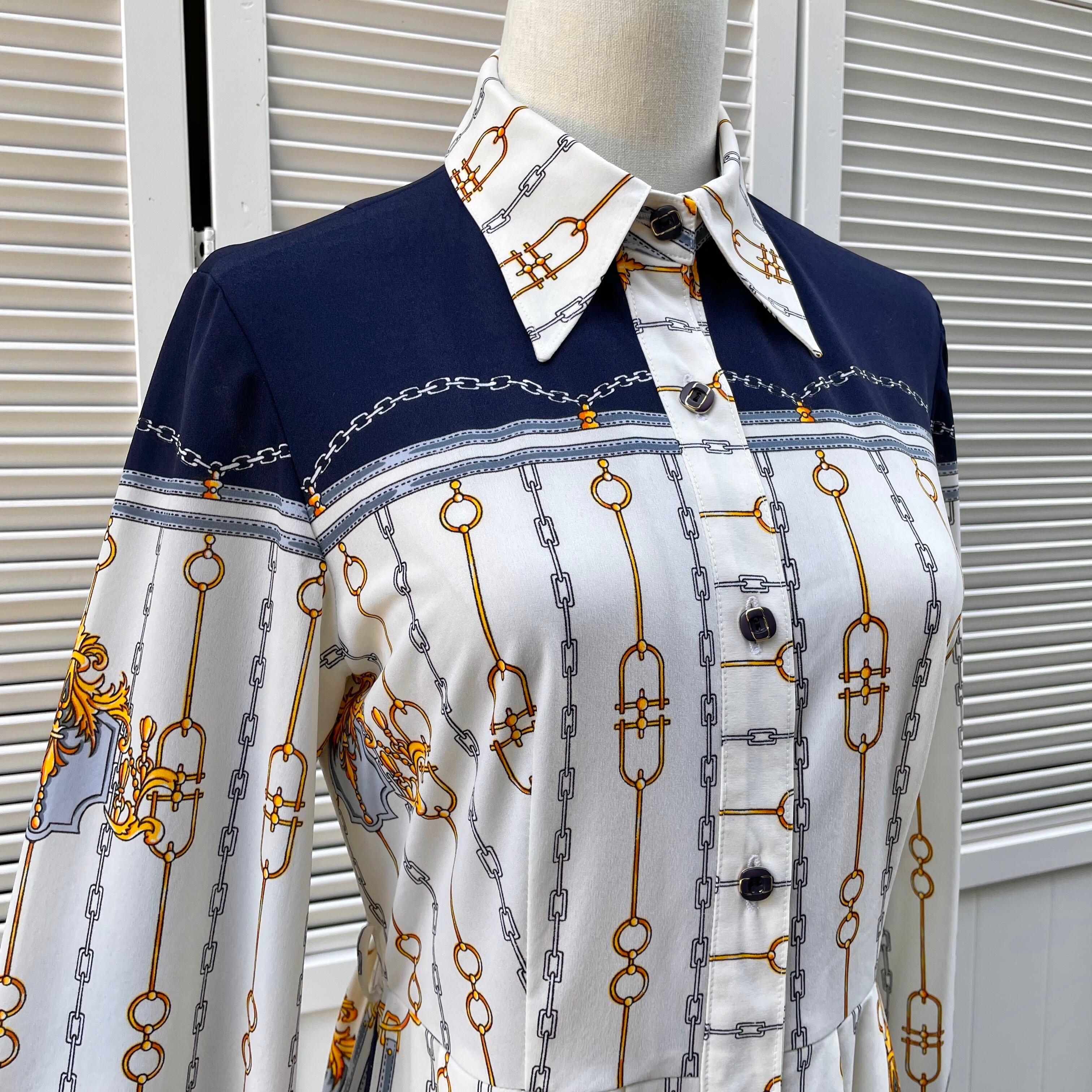 チェーンをモチーフにした絵柄に襟先の長いバリモアカラーがレトロさたっぷり
