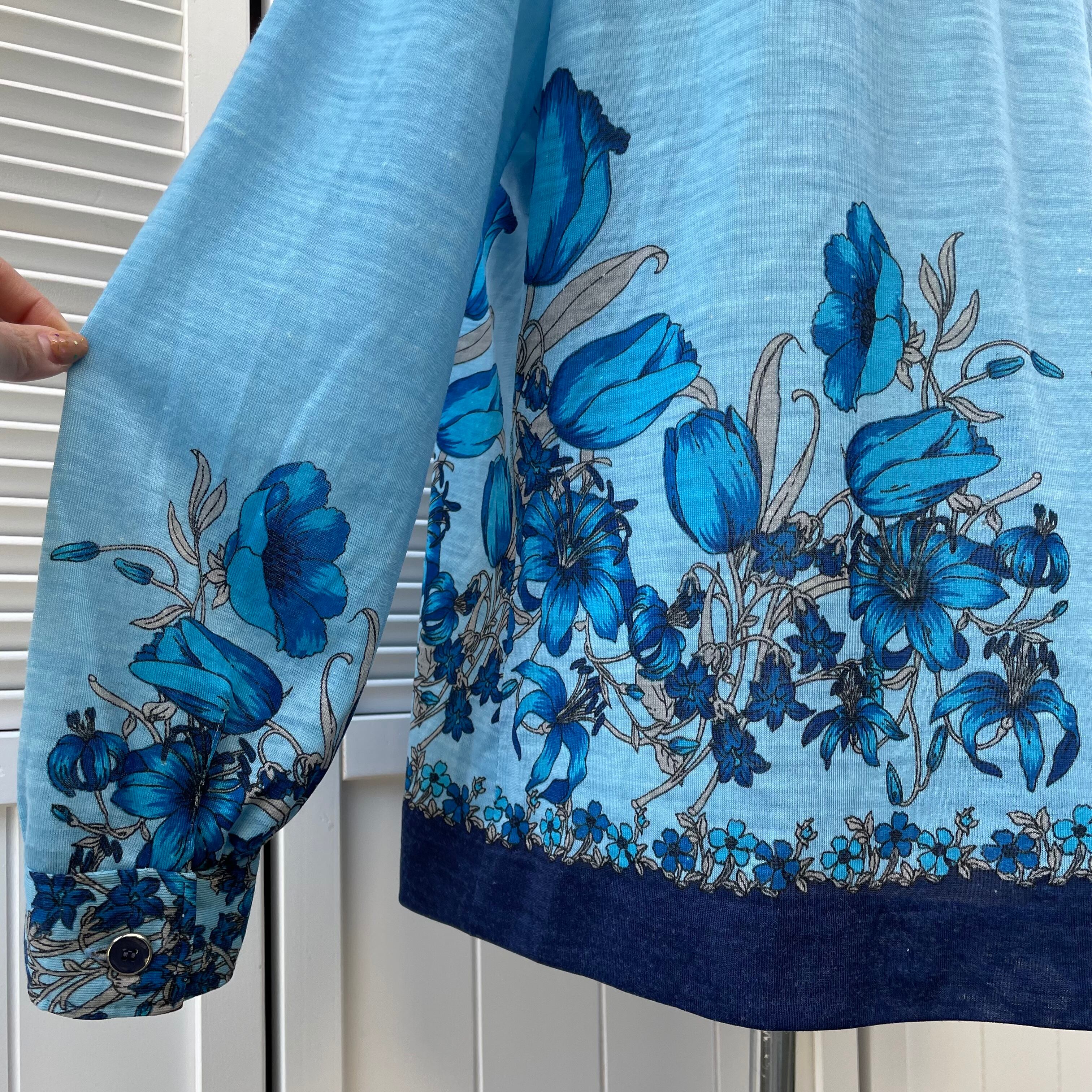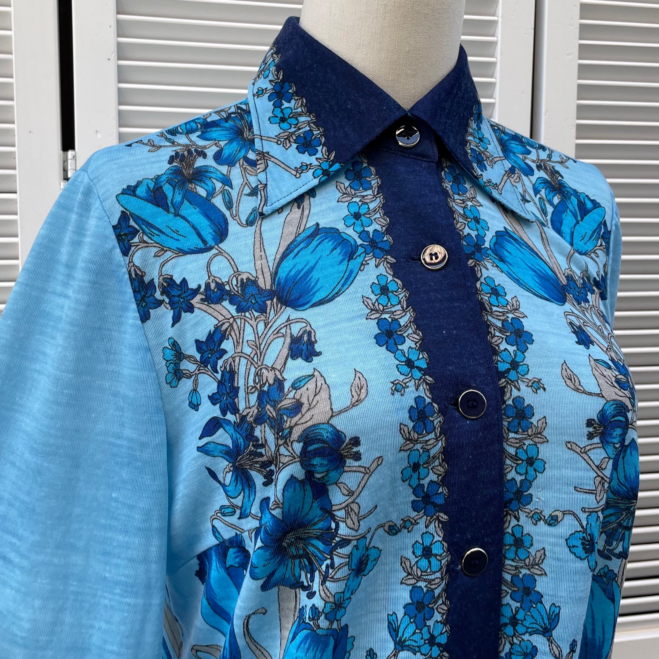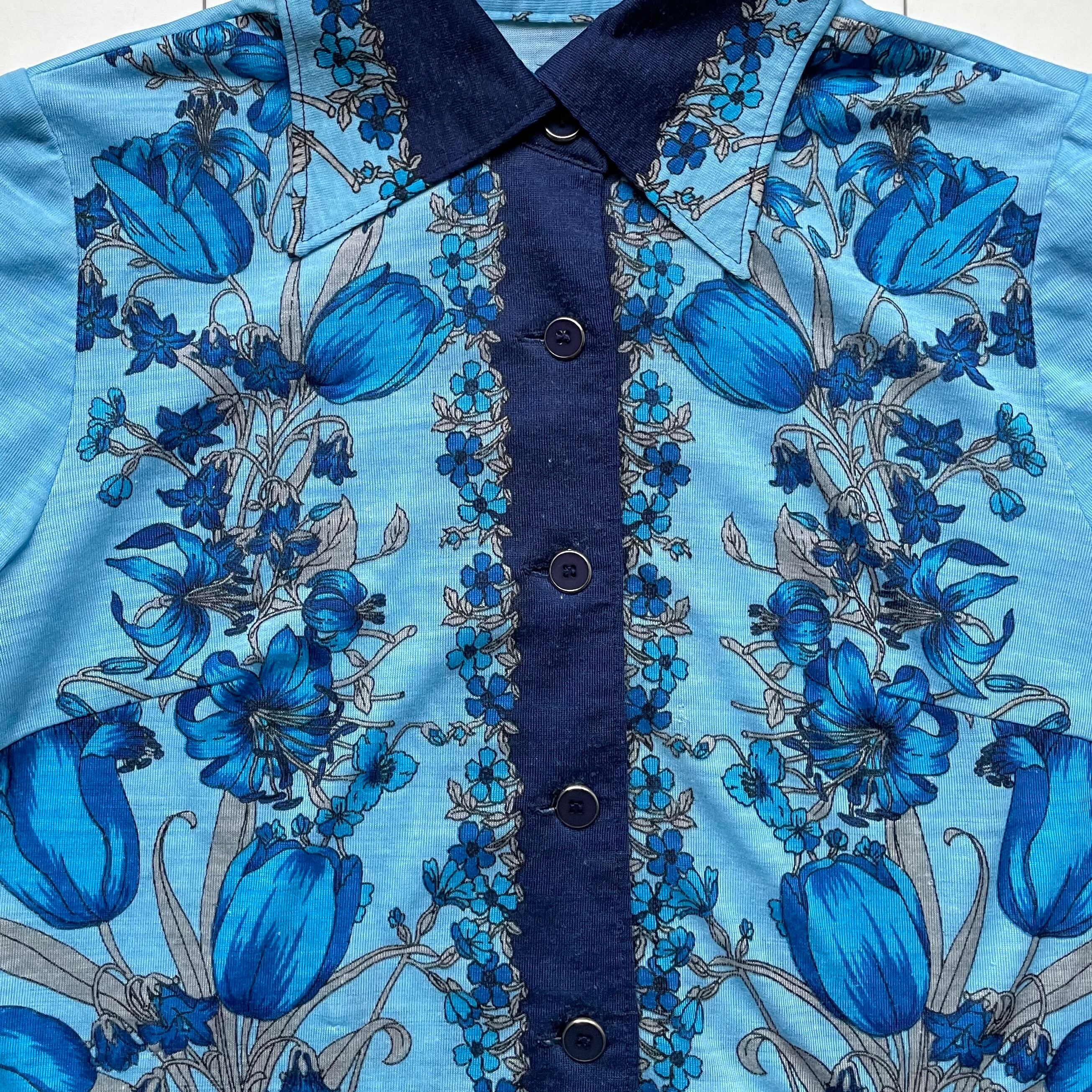 blue tulip panel pattern shirt 〈レトロ古着 ブルー チューリップ パネル柄シャツ 青 花柄 ブラウス〉