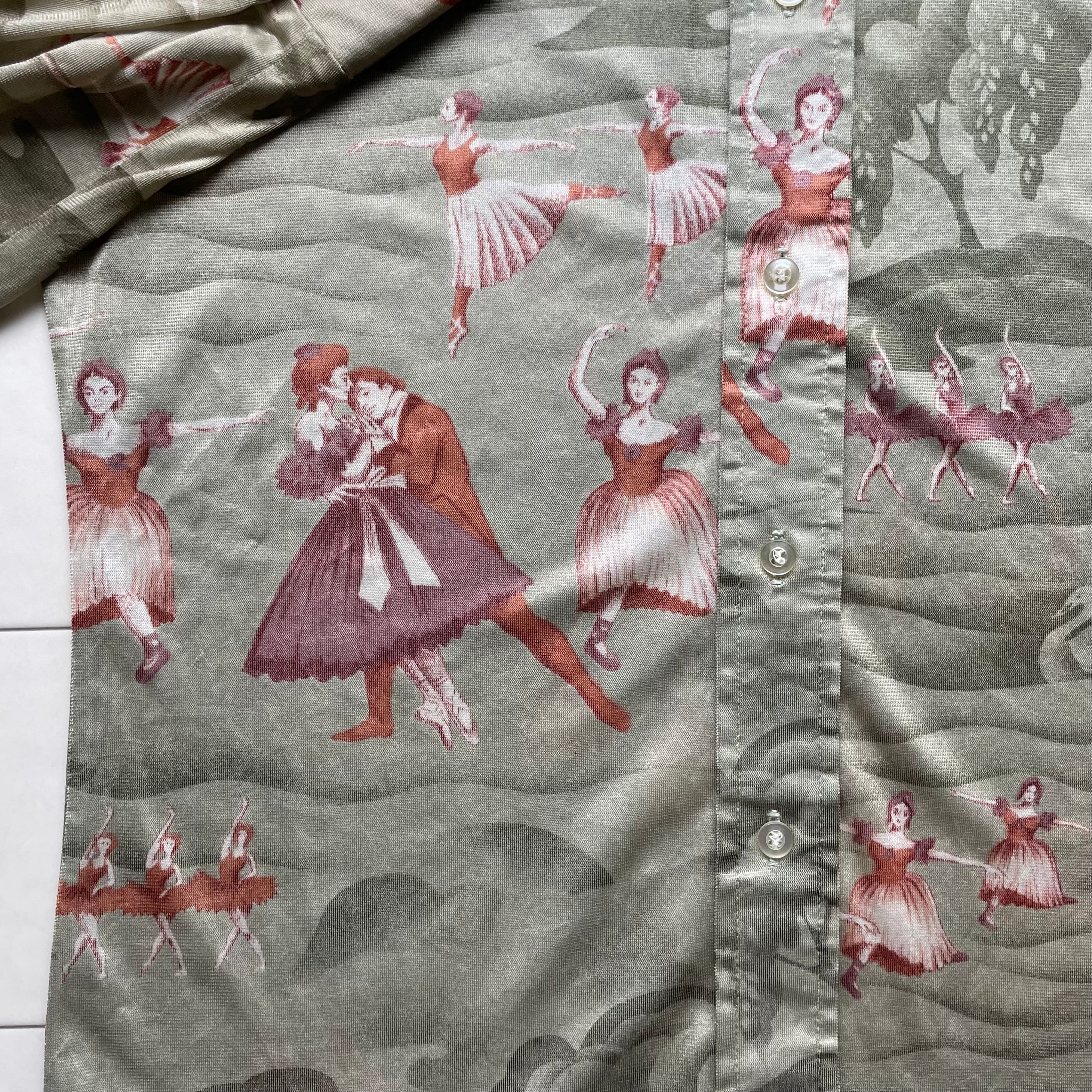 “Swan Lake” print shirt〈レトロ古着 白鳥の湖 プリント 柄シャツ ブラウス グリーン カーキ バレエ ヴィンテージ〉