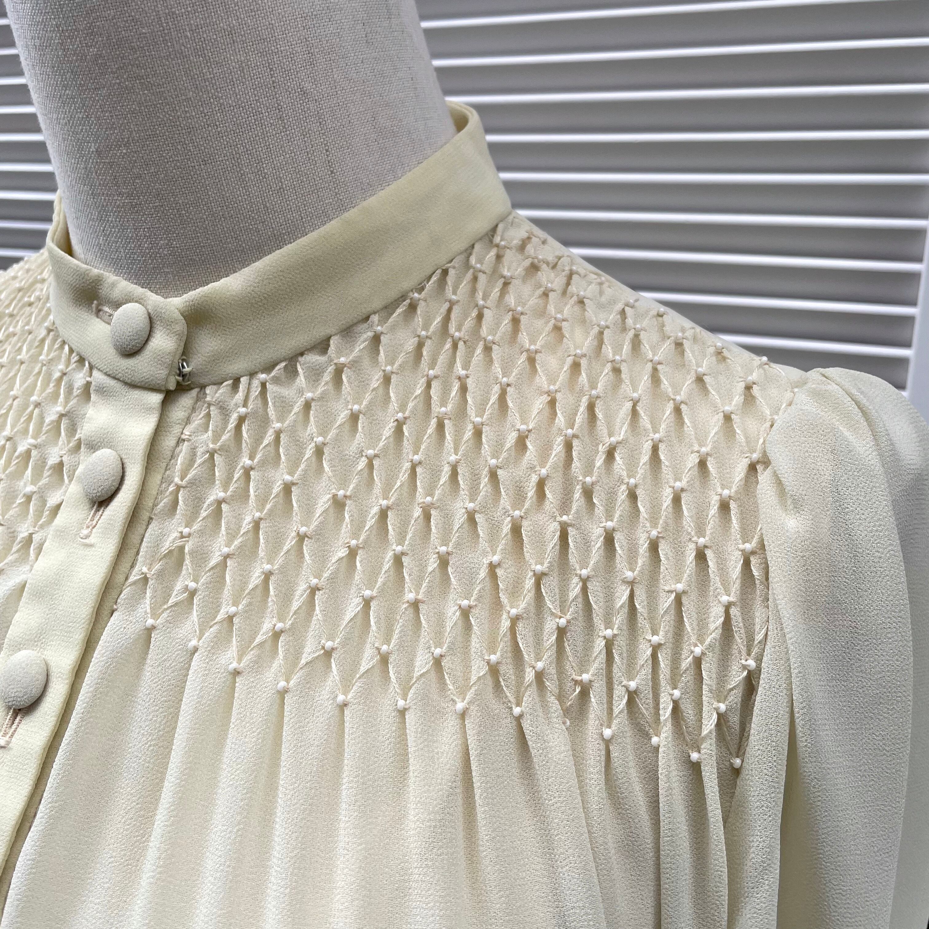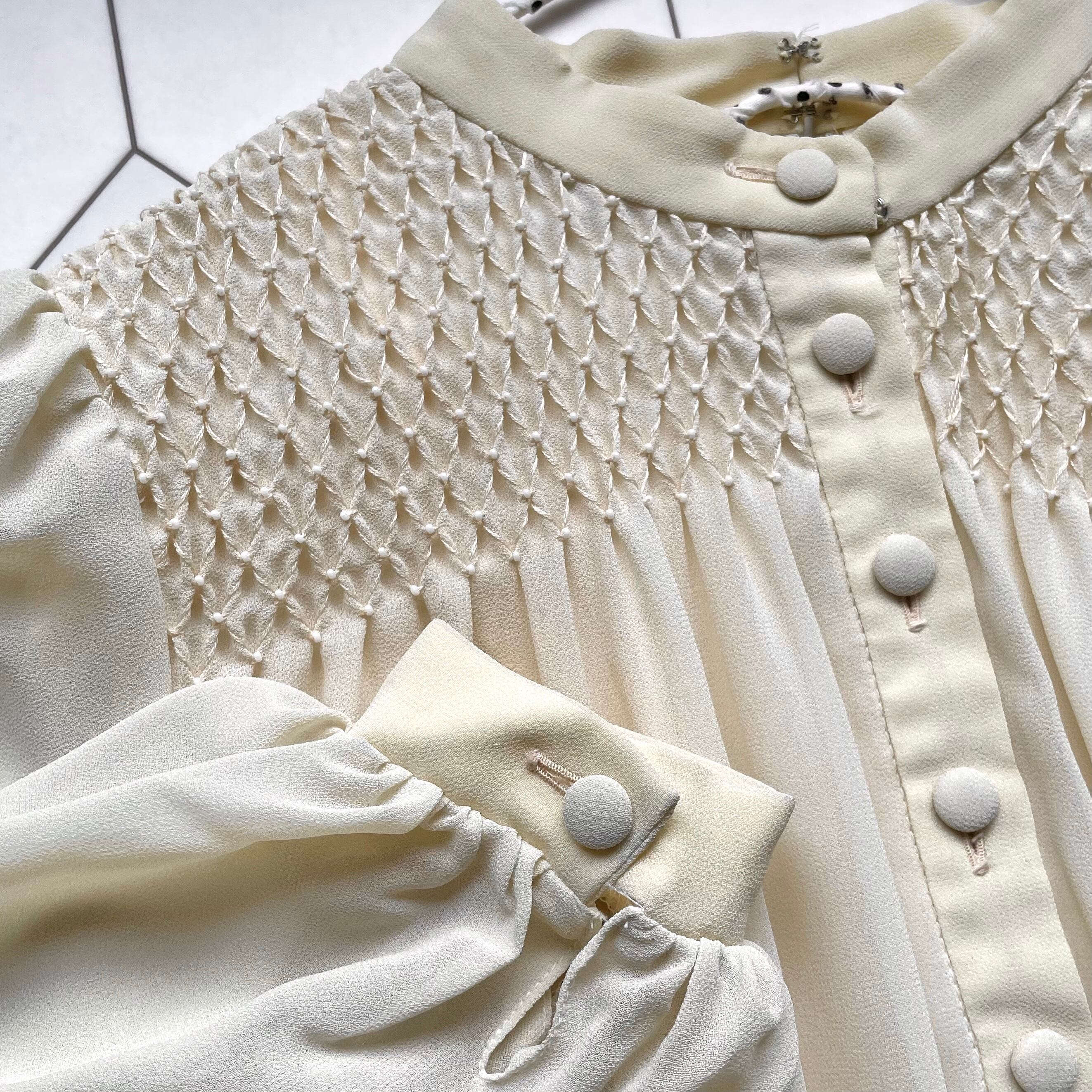 肩のスモッキング刺繍にはひとつひとつ小さなビーズがあしらわれたとても凝った一点