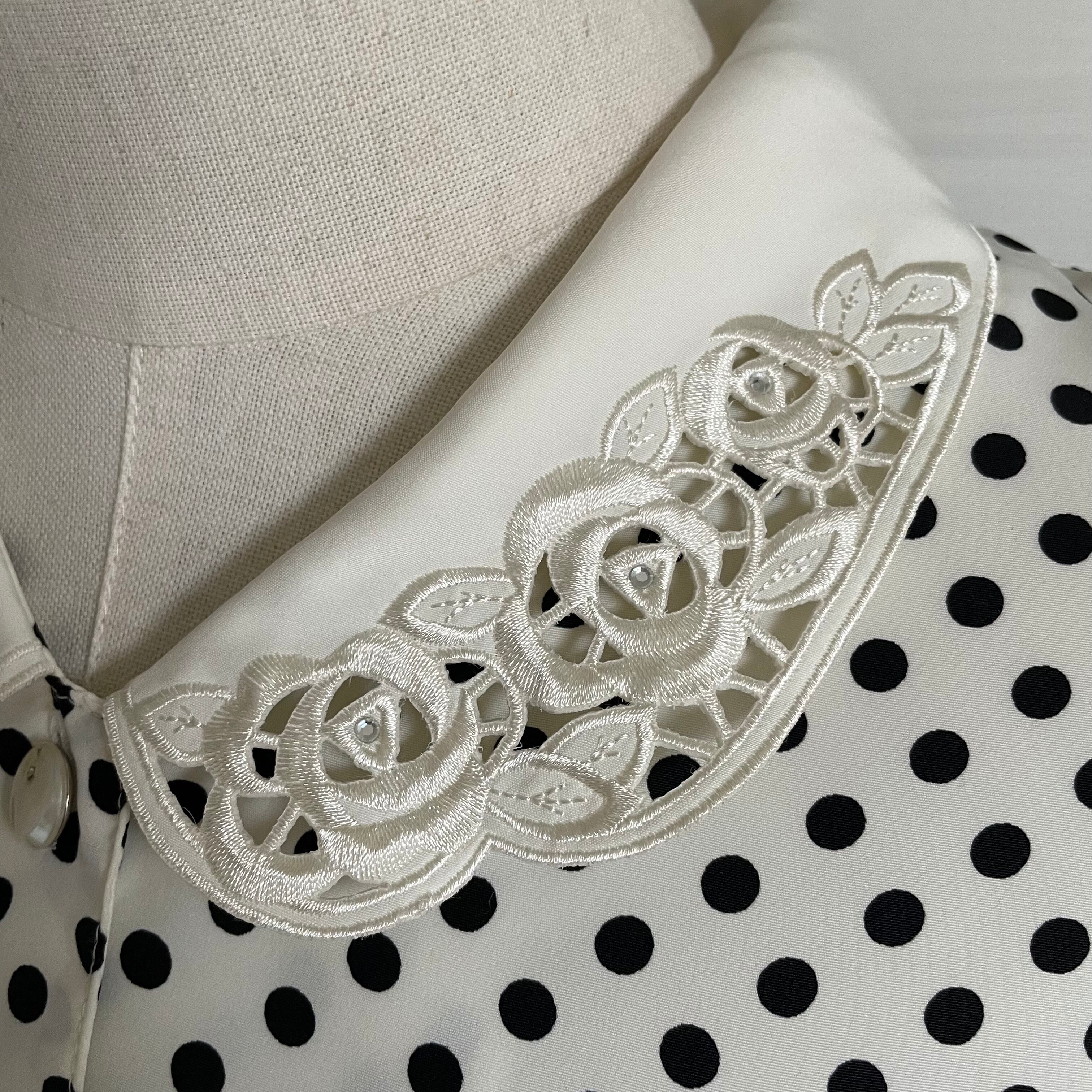 襟に薔薇のカットワーク刺繍が施されたドットのブラウス