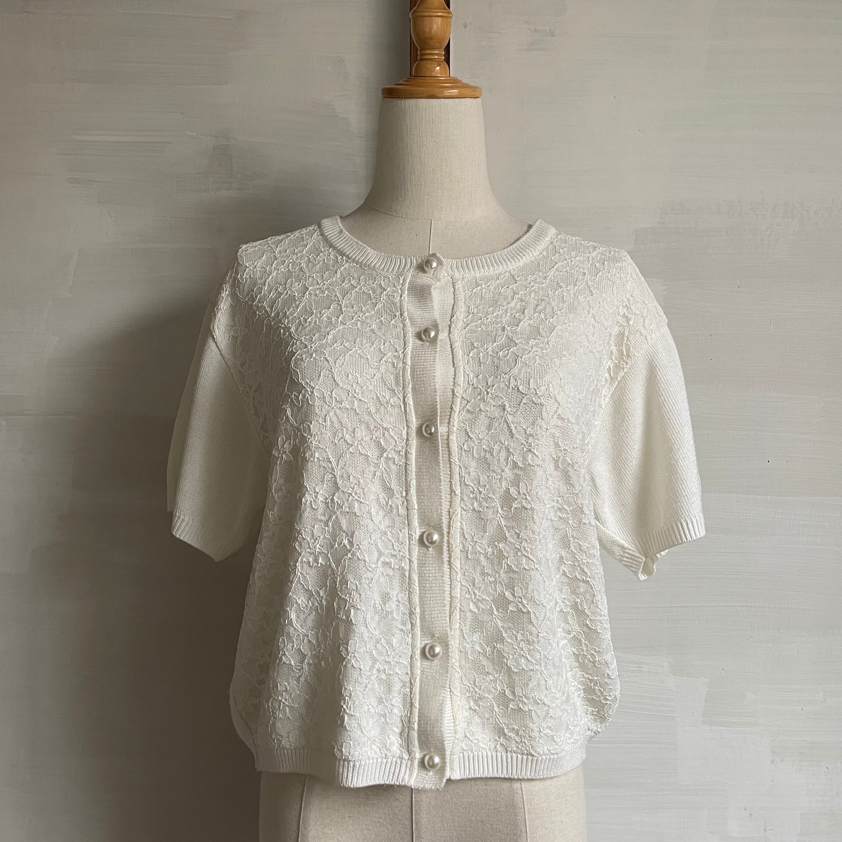 cord lace pearl button cardigan 〈レトロ古着 コードレース パールボタン カーディガン ホワイト〉