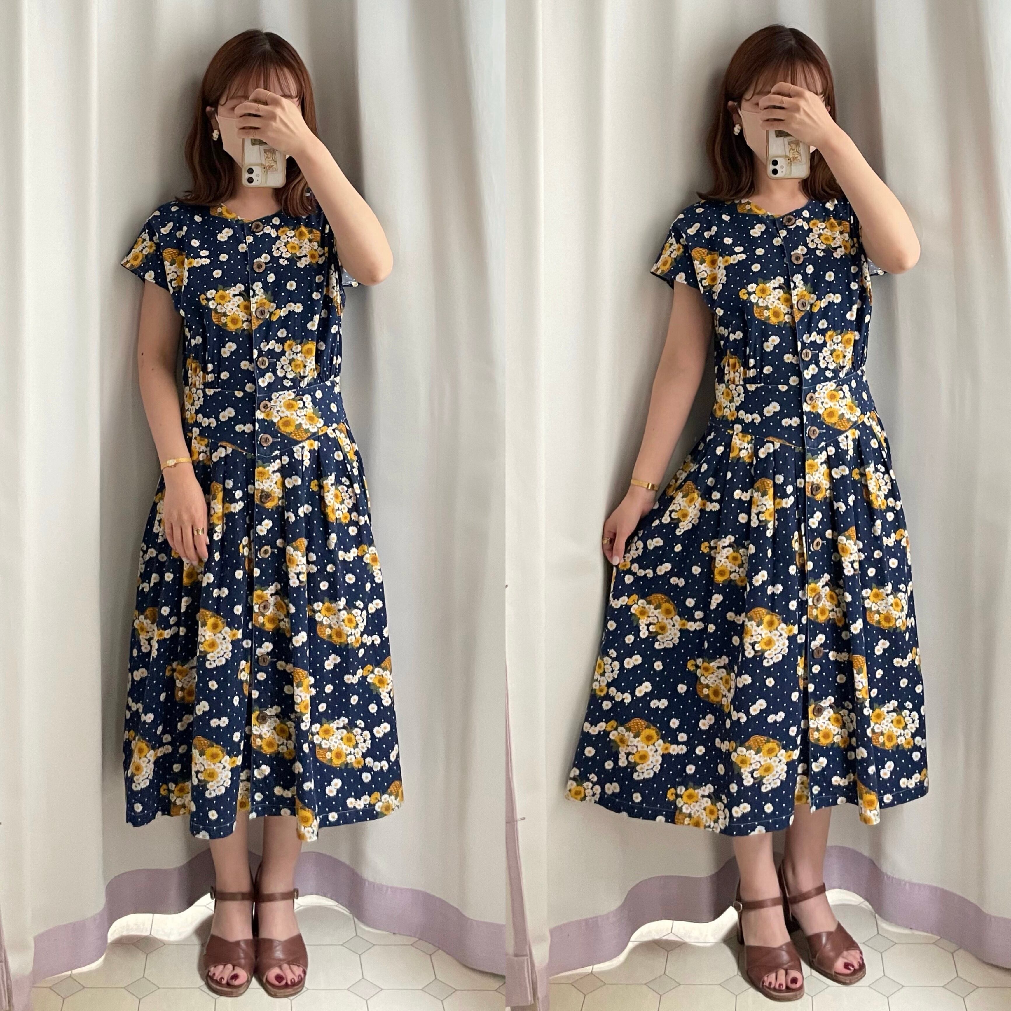 sunflower print french sleeve dress〈レトロ古着 向日葵柄 フレンチスリーブ ワンピース〉