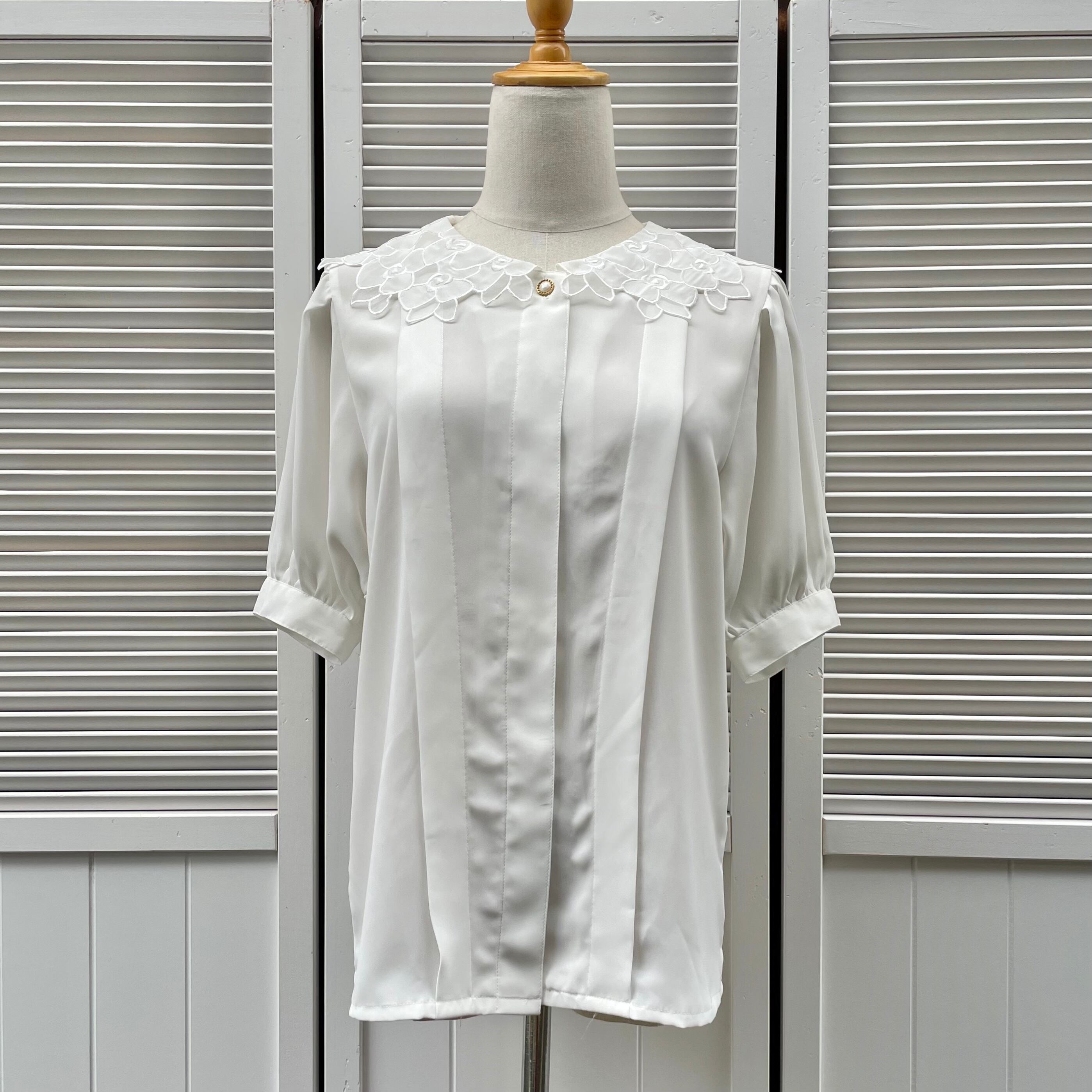 flower motif sheer collar blouse〈レトロ古着 フラワーモチーフ シアーカラー ブラウス 白 日本製〉