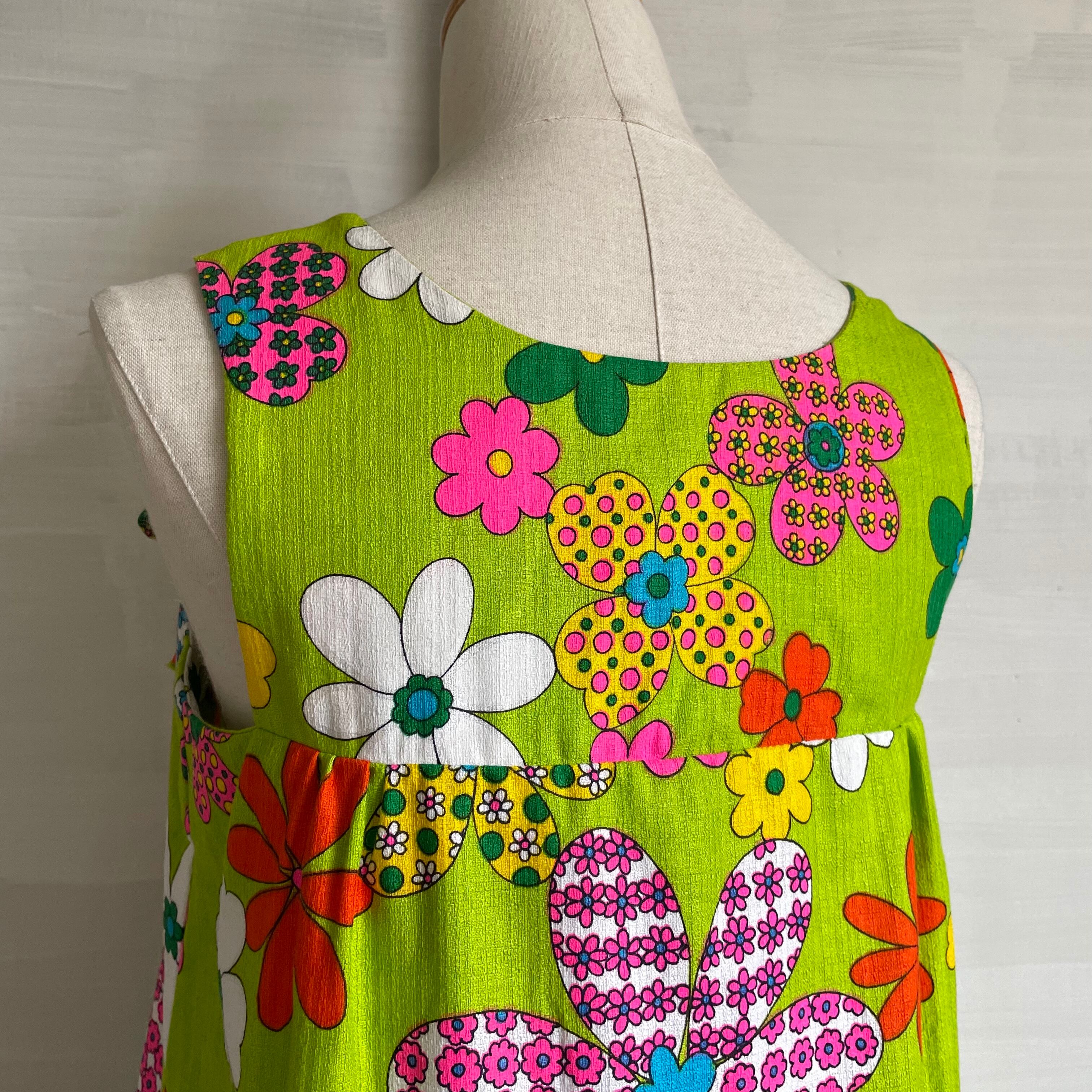 colorful floral sleeveless dress〈レトロ古着 カラフル 花柄 ノースリーブワンピース 黄緑〉