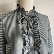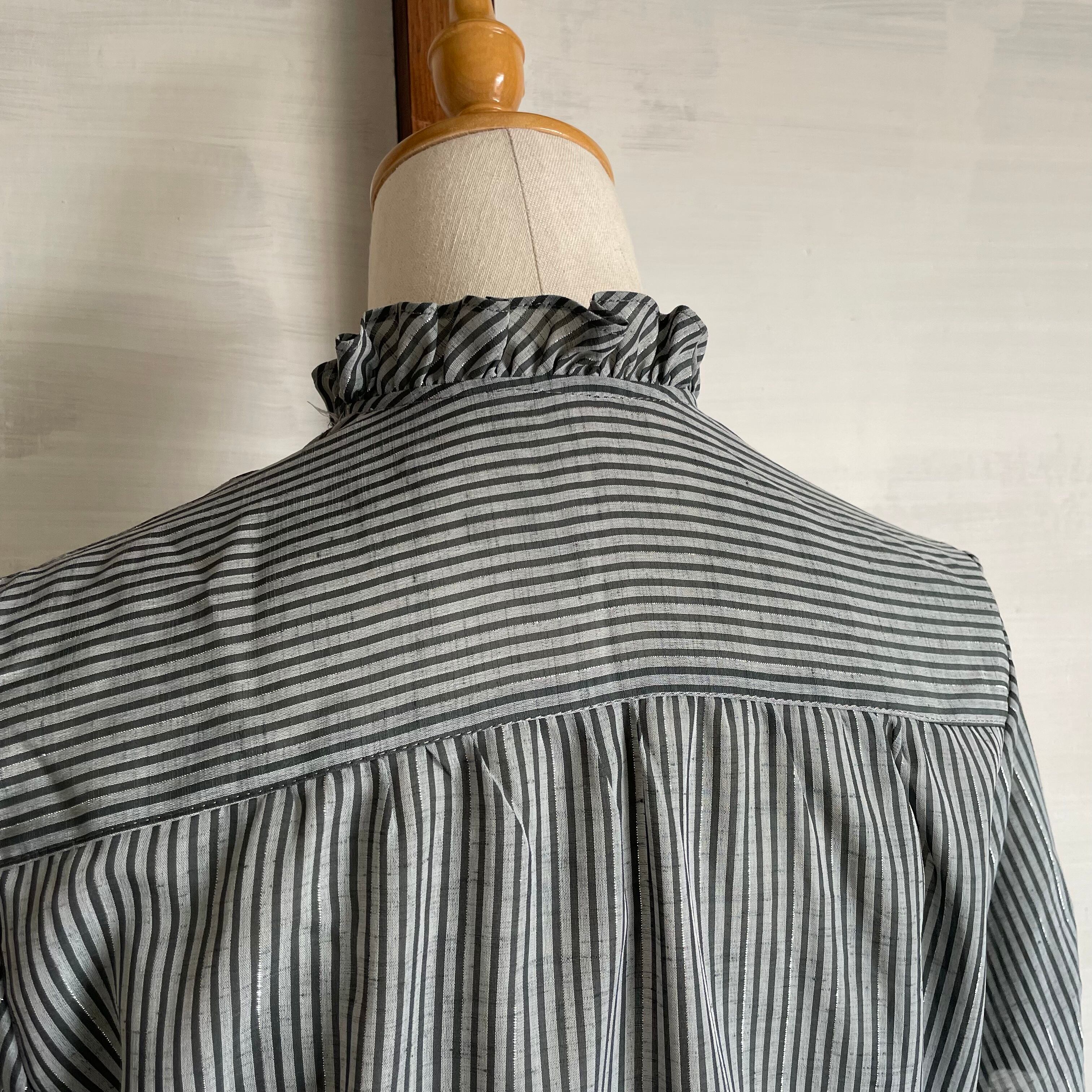 lame stripe frill bowtie blouse 〈レトロ古着 ラメ糸混 ストライプ柄 フリル ボウタイブラウス グレー〉