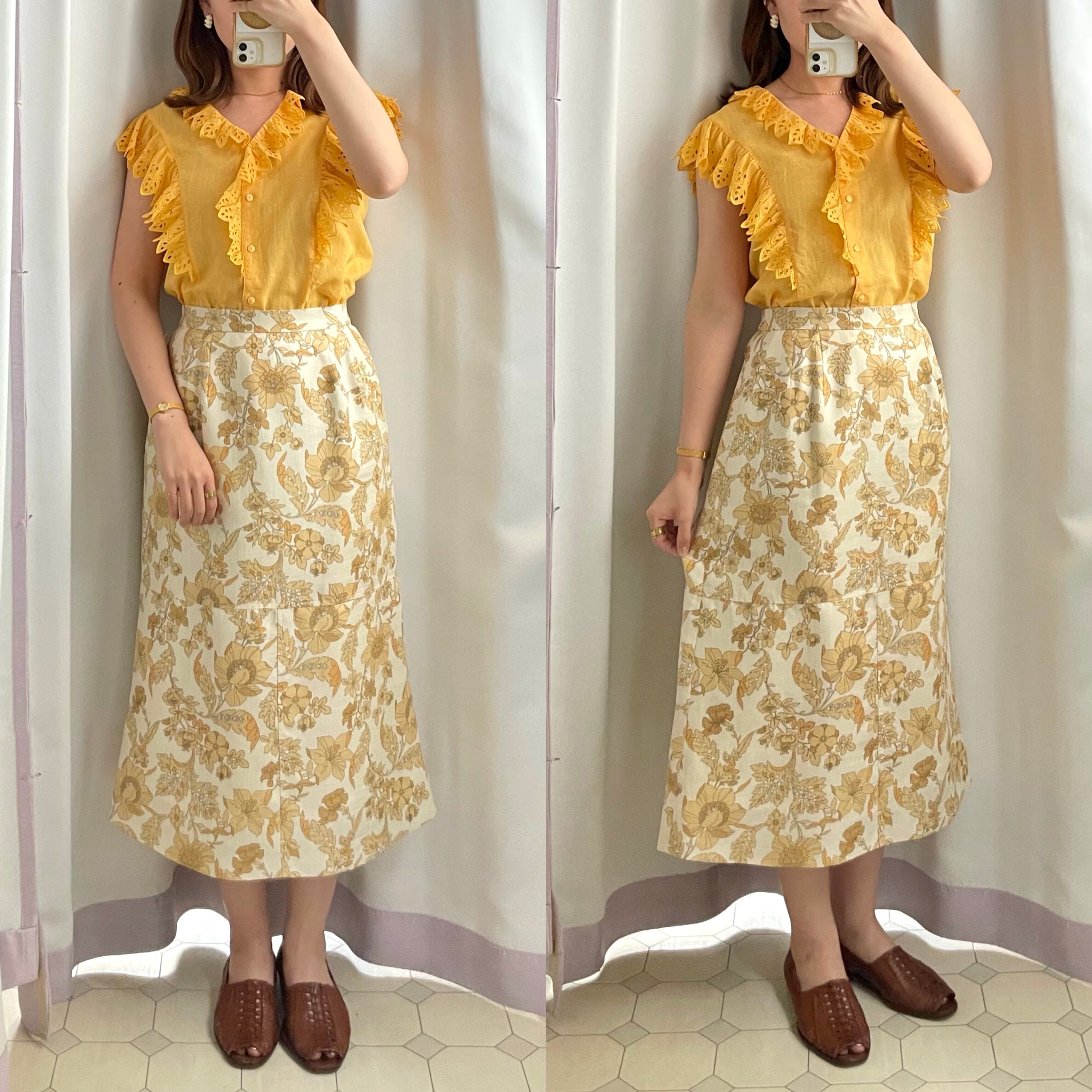botanical pattern semi-flared skirt 〈レトロ古着 ボタニカル柄 セミフレアスカート 日本製 黄色 花柄〉