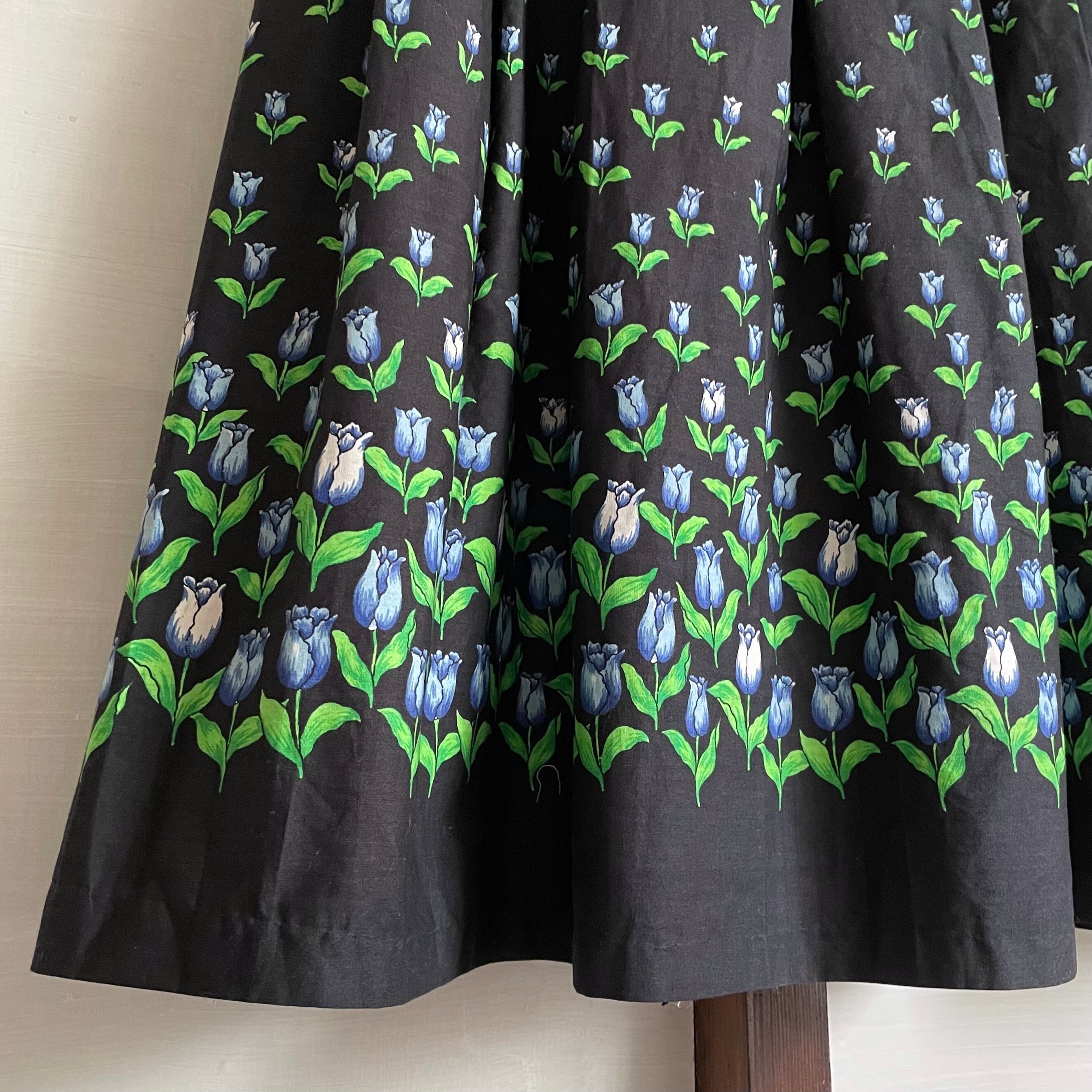 裾にかけてだんだんと大きくなっていく青いチューリップ柄のスカート