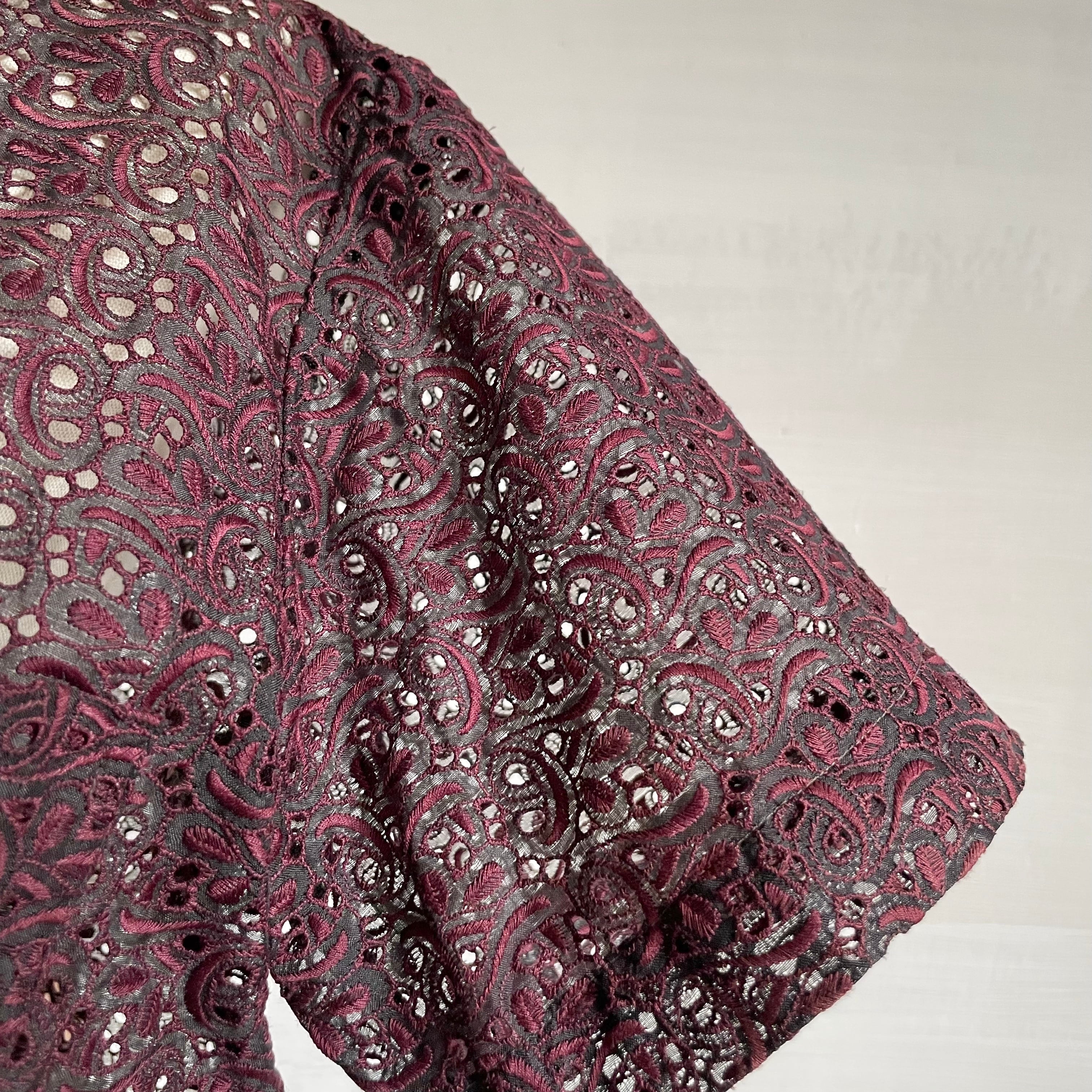 透け感たっぷりなバーガンディーカラーの総レースシャツ