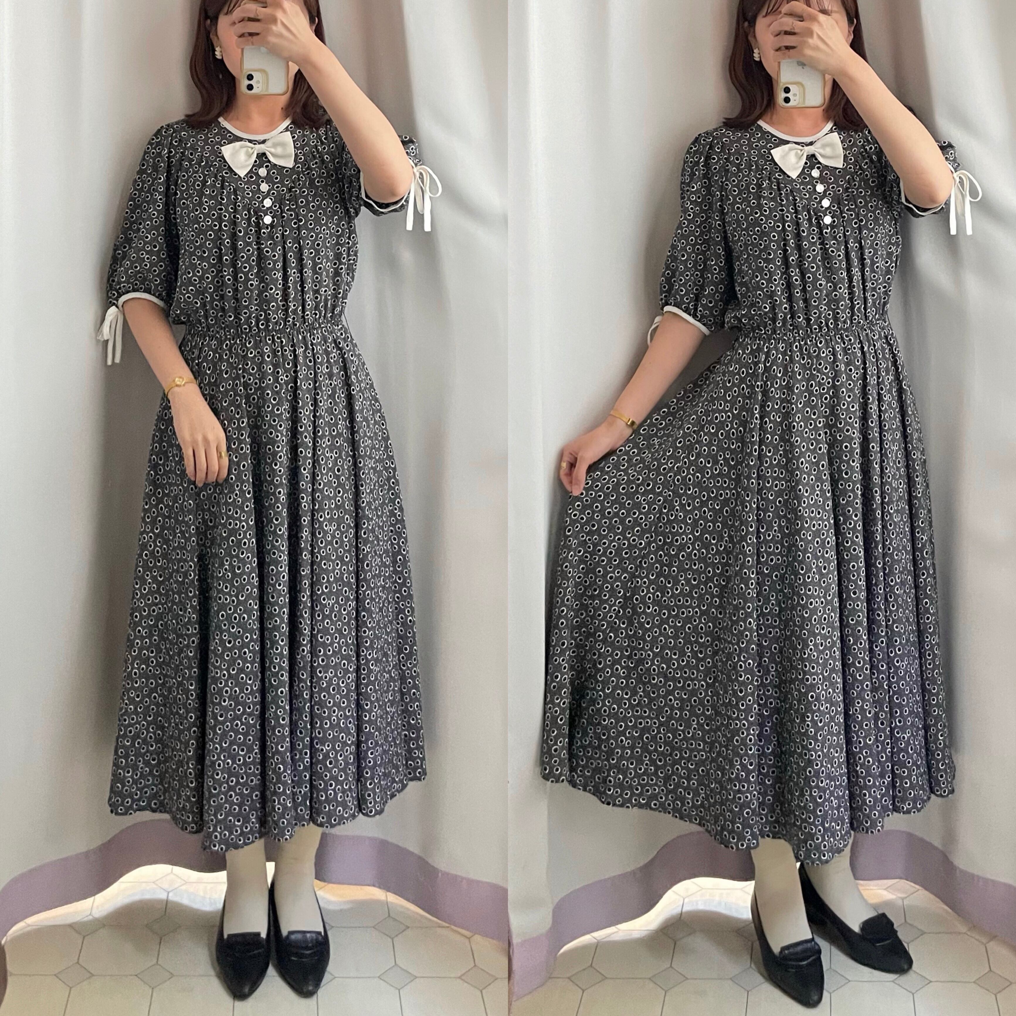 ribbon design dot pattern dress〈レトロ古着 リボン デザイン ドット柄 ワンピース 水玉 黒 日本製〉