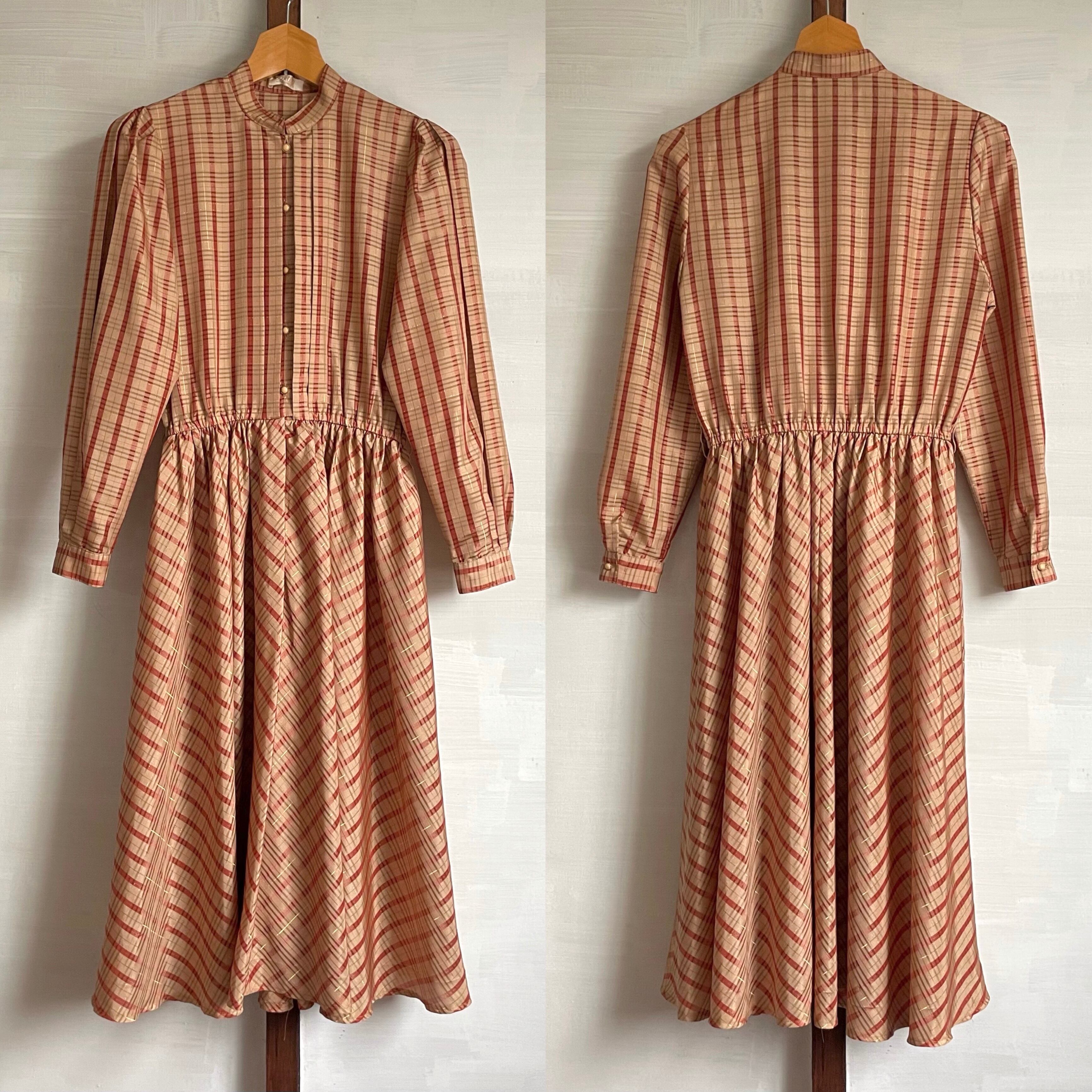 ベージュ地に赤のラインが映えたチェック柄のワンピース