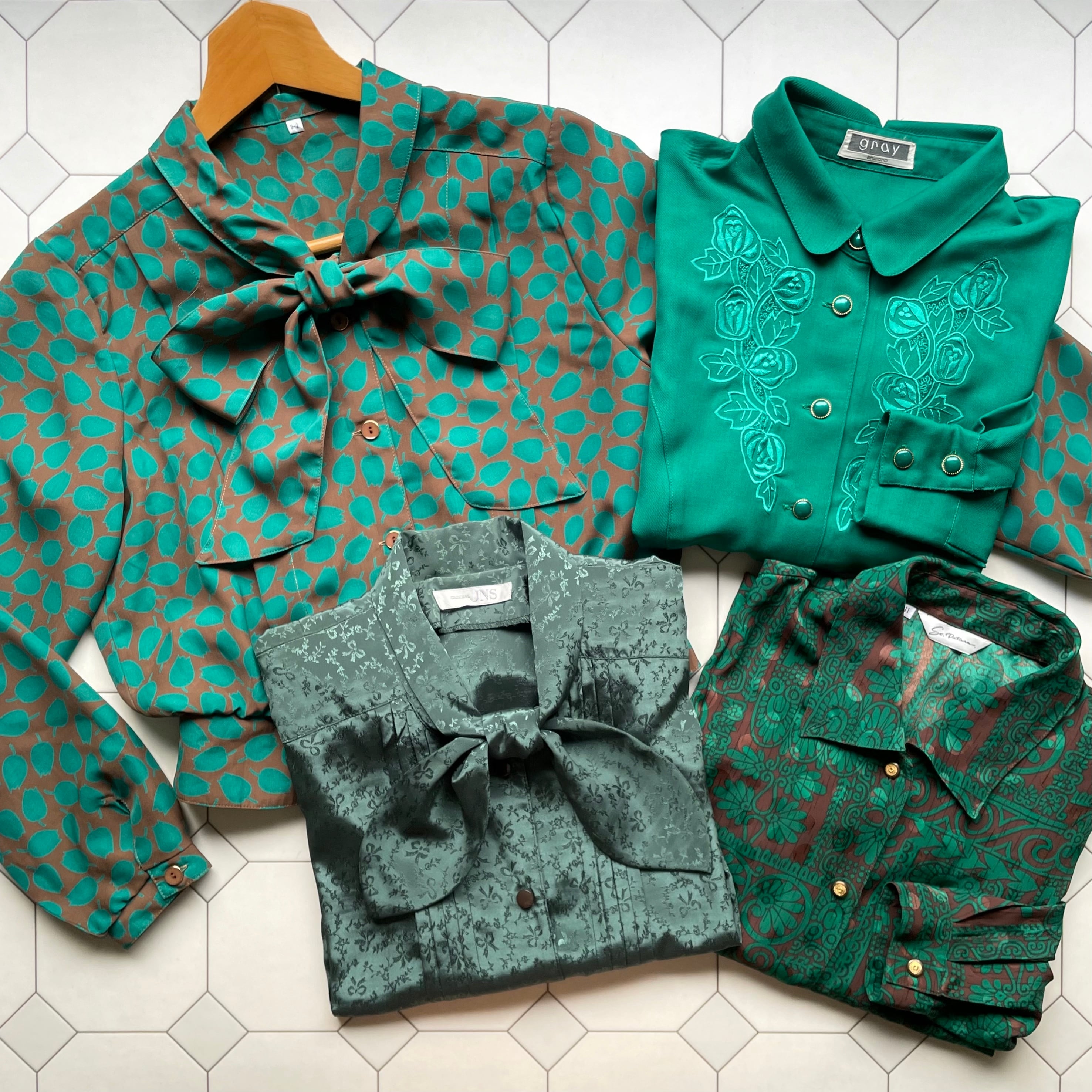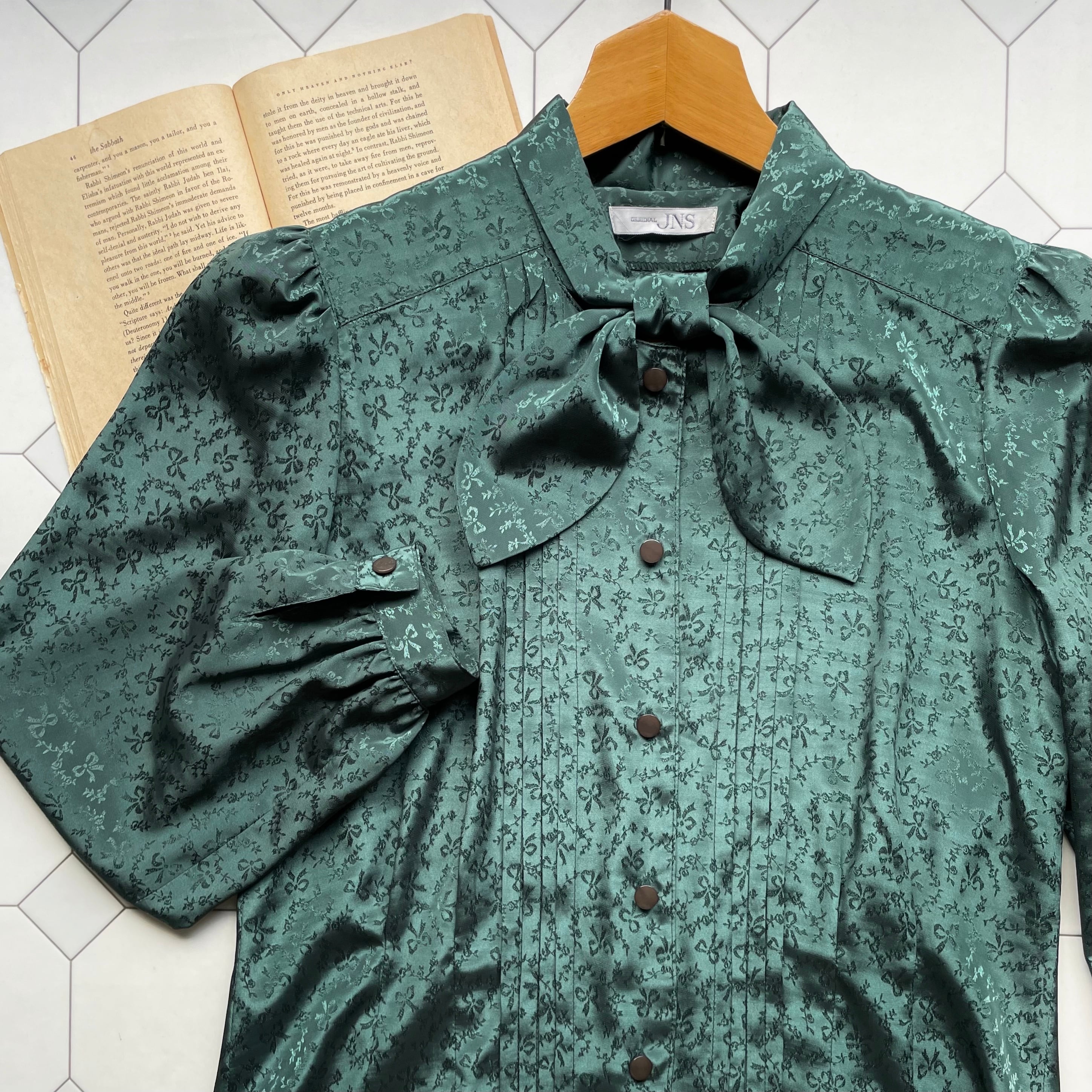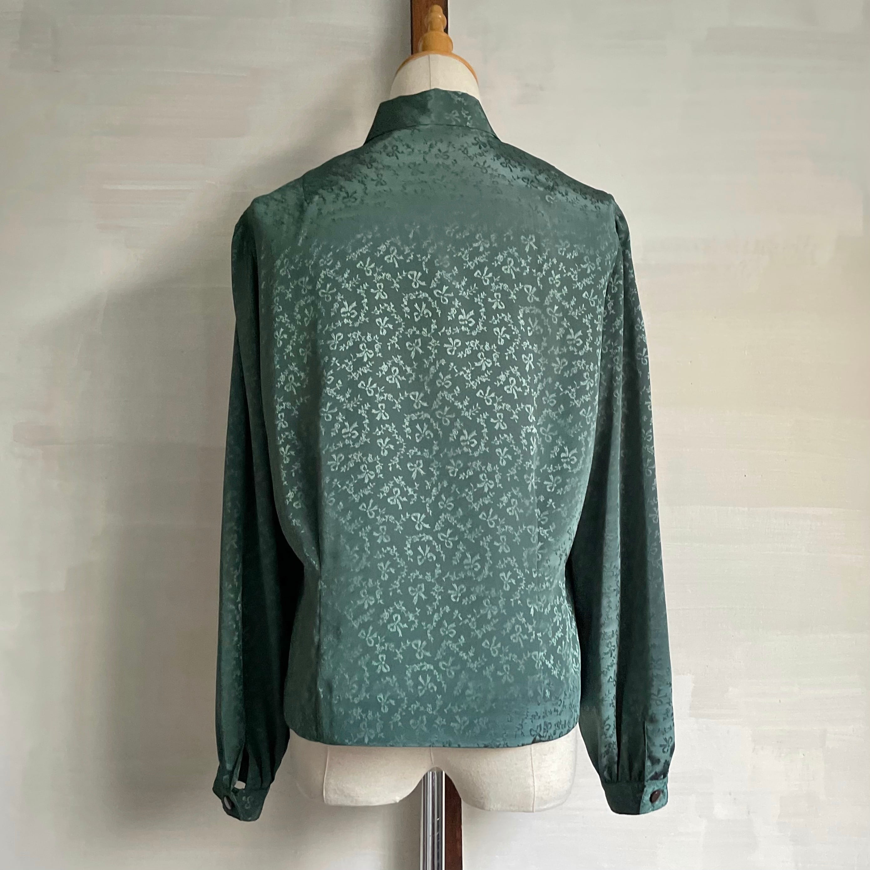 ribbon motif moss green bowtie blouse 〈レトロ古着 リボン柄 モスグリーン ボウタイブラウス 日本製 緑〉