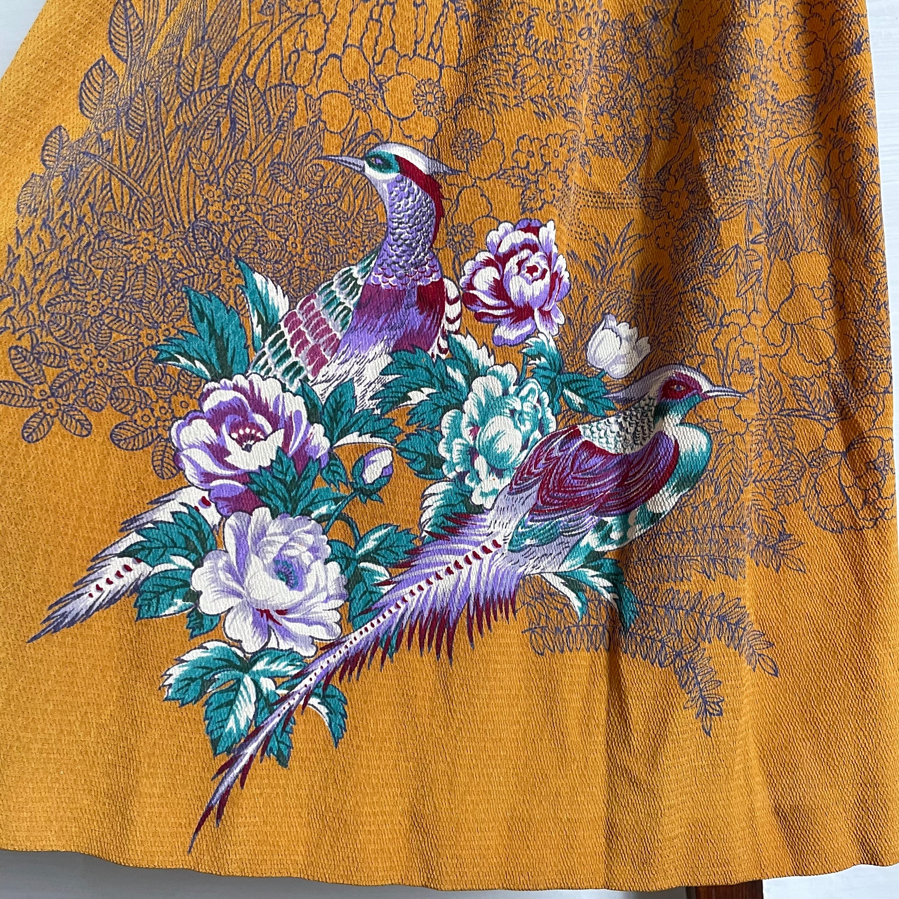 マスタードイエローに描かれた華やかな鳥とお花が特徴的なシノワズリ調のワンピース