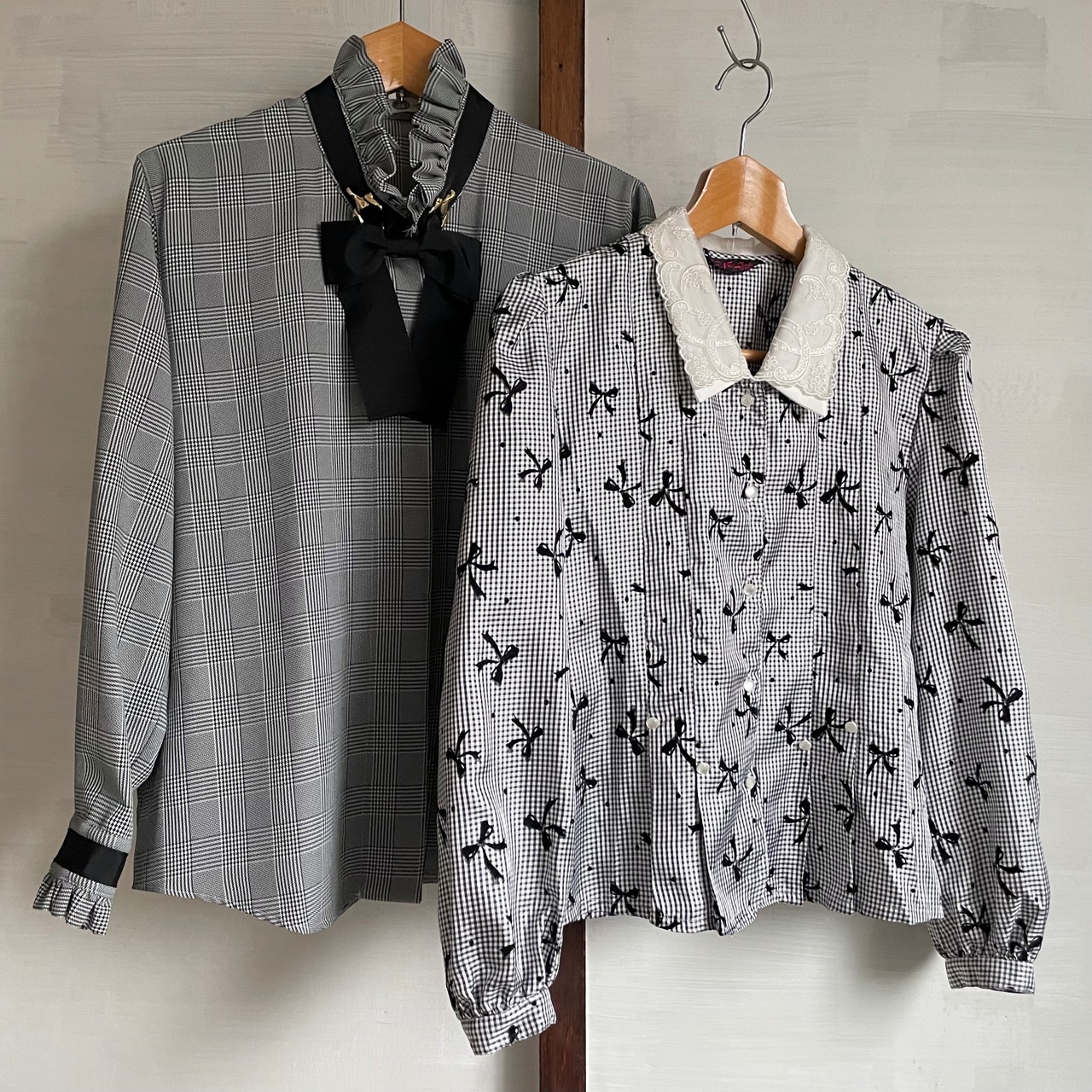 flocky print ribbon motif blouse〈レトロ古着 フロッキープリント リボン柄 ブラウス 日本製 〉