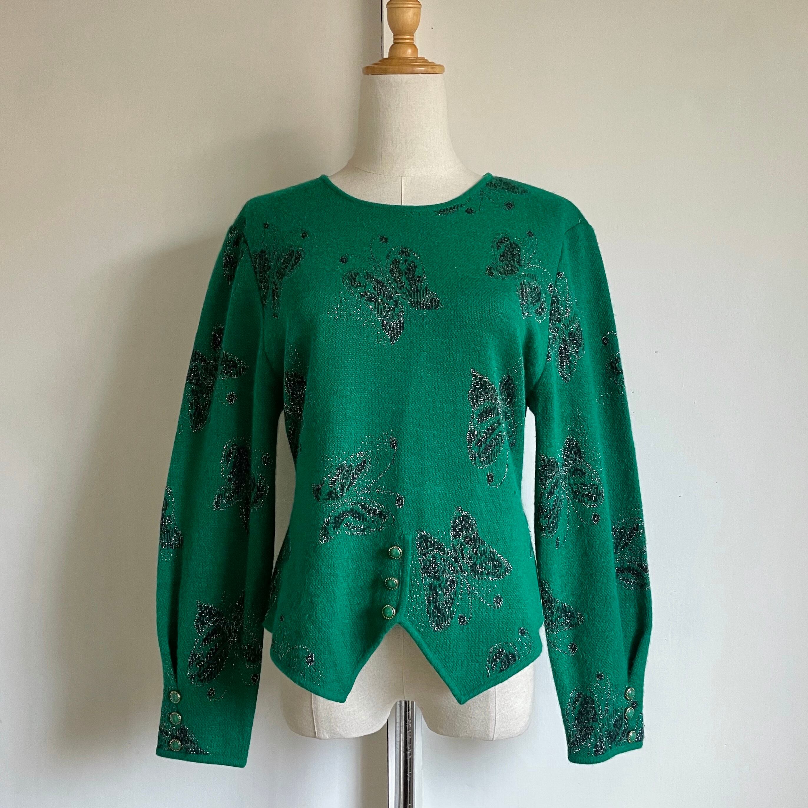 butterfly motif lame mixed sweater 〈レトロ古着 蝶々柄 ラメ糸混 セーター 緑 アンゴラ混 ニット〉