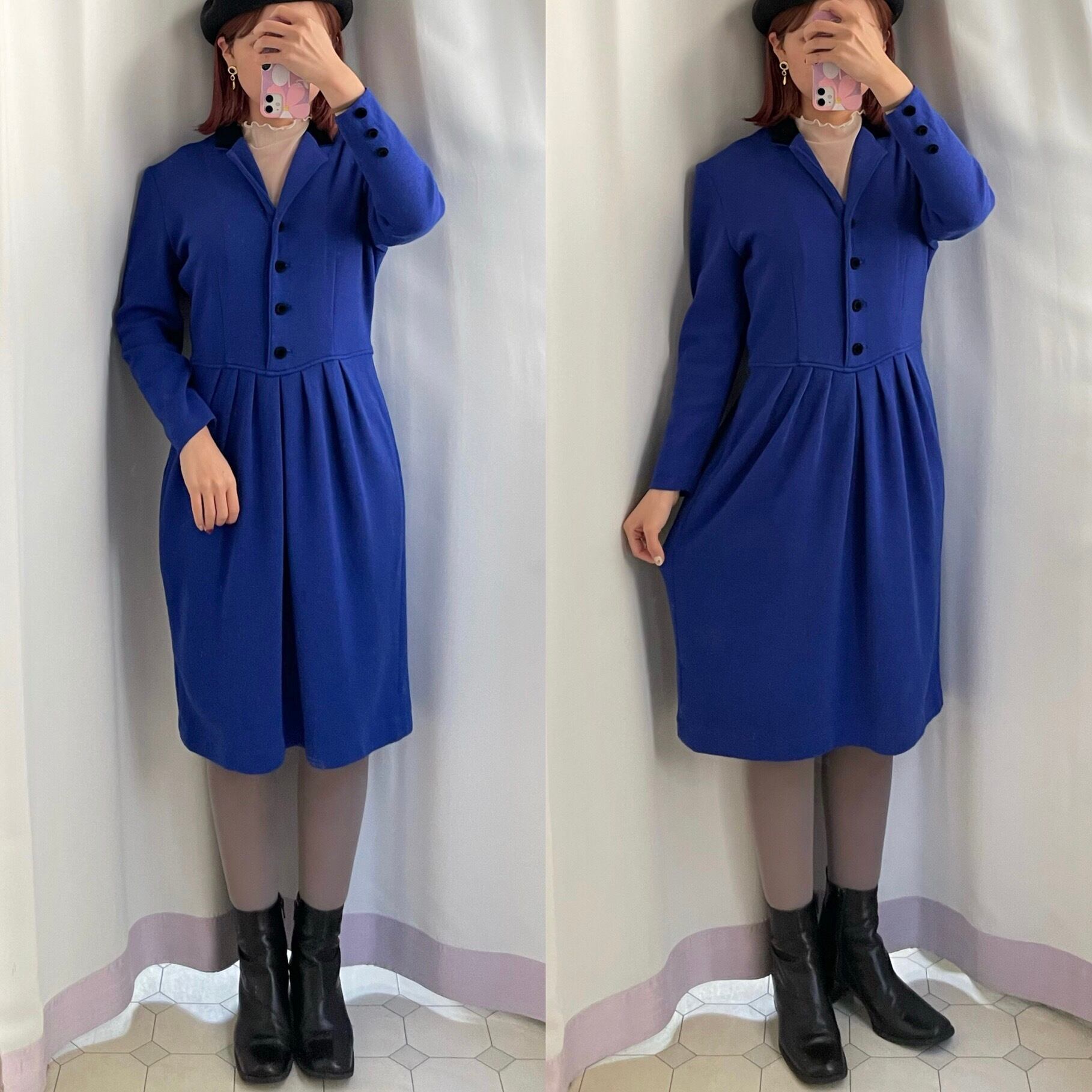 velvet collar knit dress〈レトロ古着 ベルベット襟 ニットワンピース 青 別珍〉