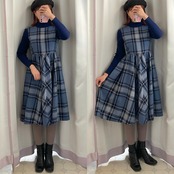 袖と首元がリブ切替えされたタータンチェックのワンピース