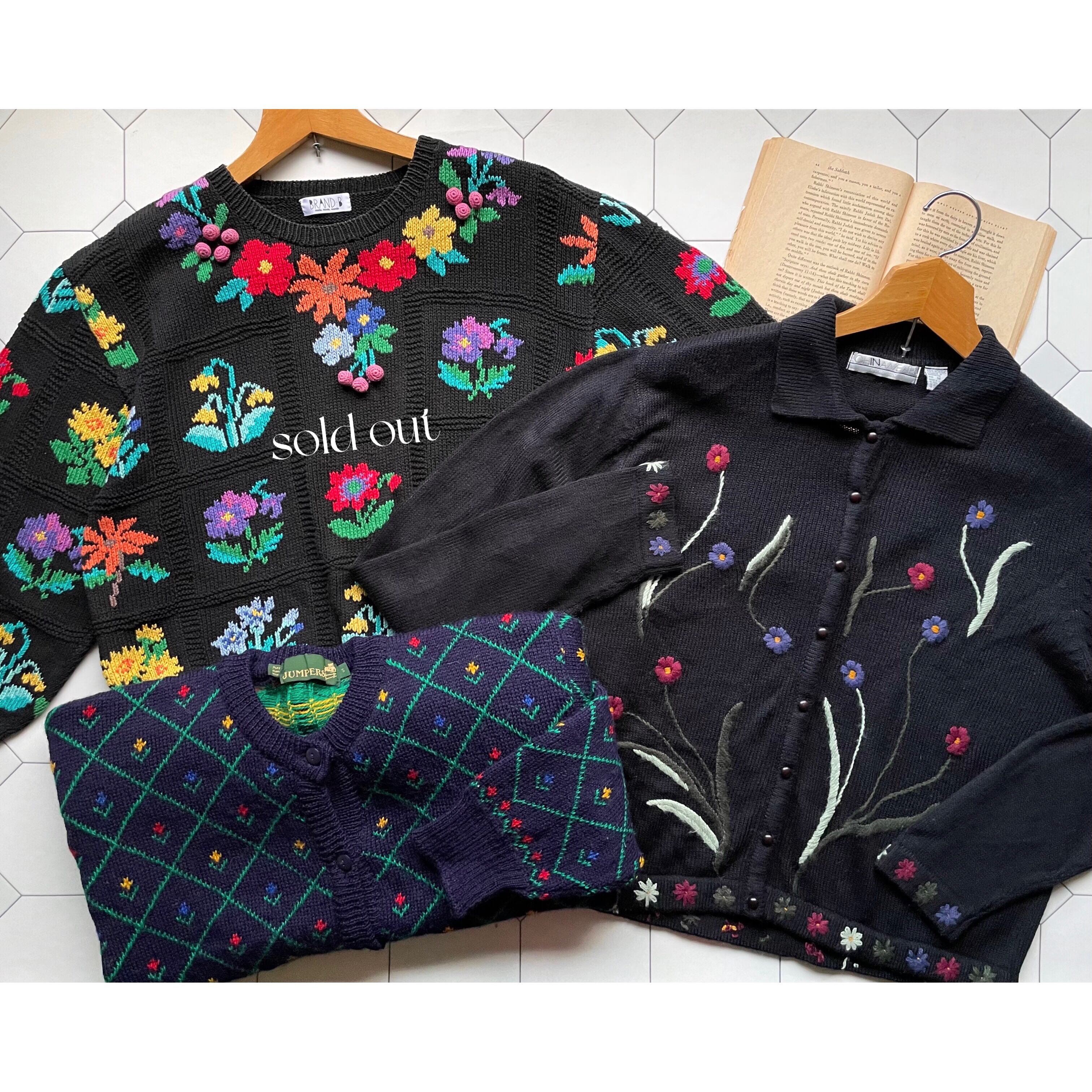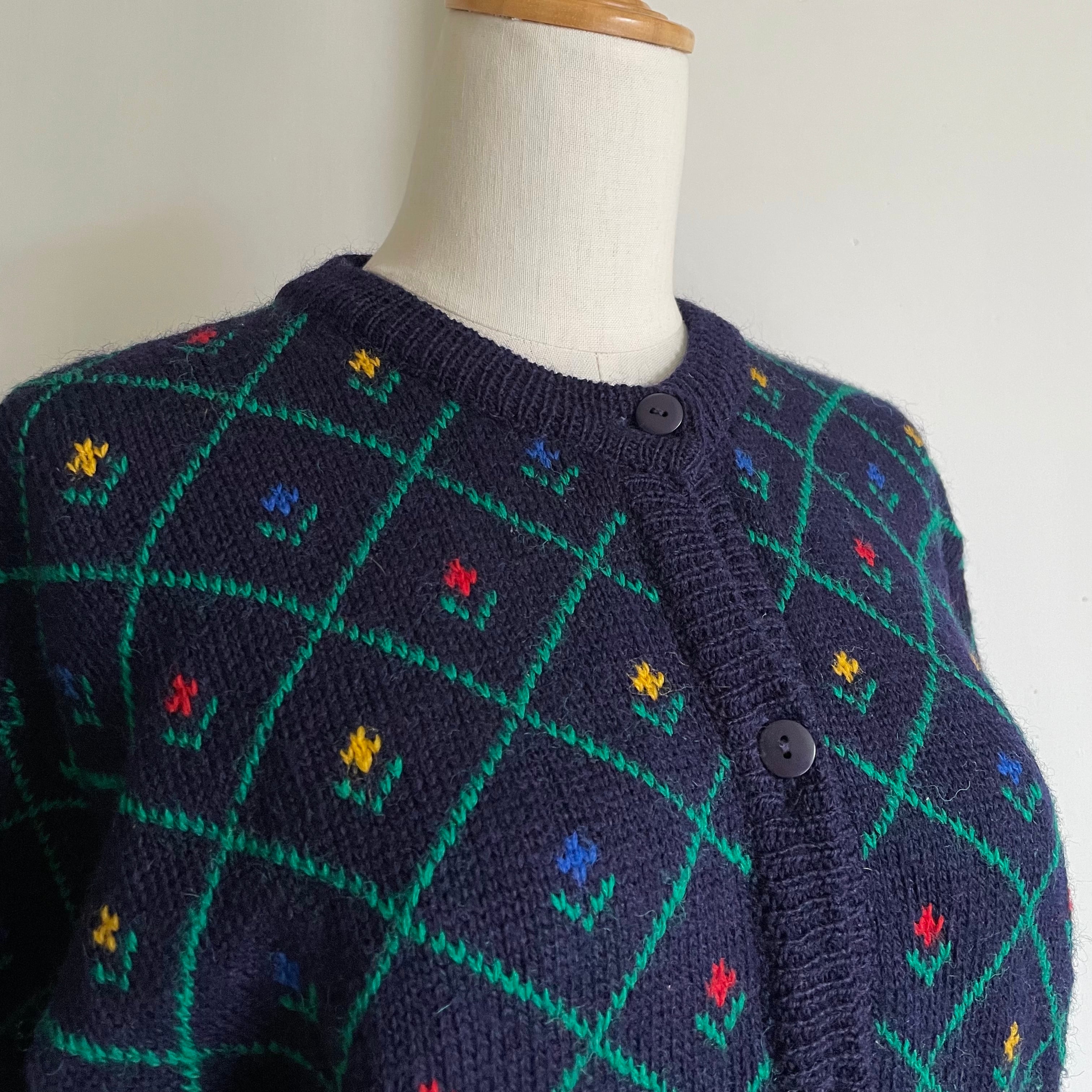 tulip × plaid wool cardigan 〈レトロ古着 チューリップ × 格子柄 カーディガン 柄ニット 紺〉