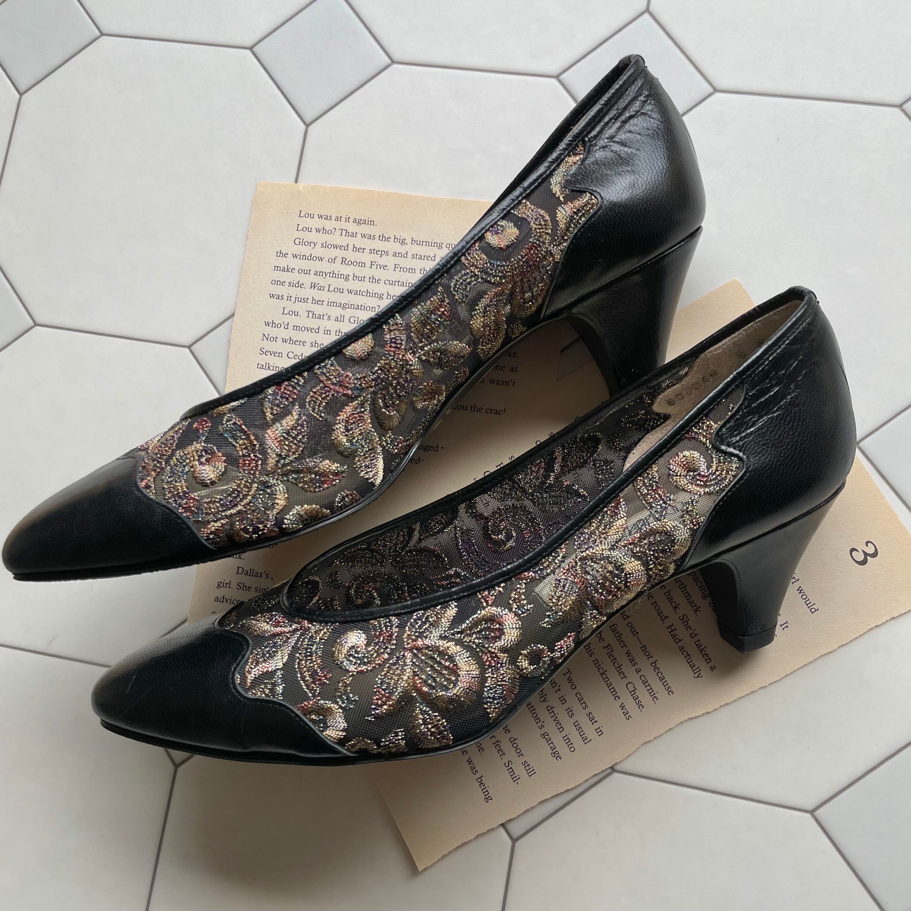 glitter embroidered sheer pumps〈レトロ古着 ラメ刺繍 シアーパンプス 黒 靴 シューズ 23〜23.5cm〉