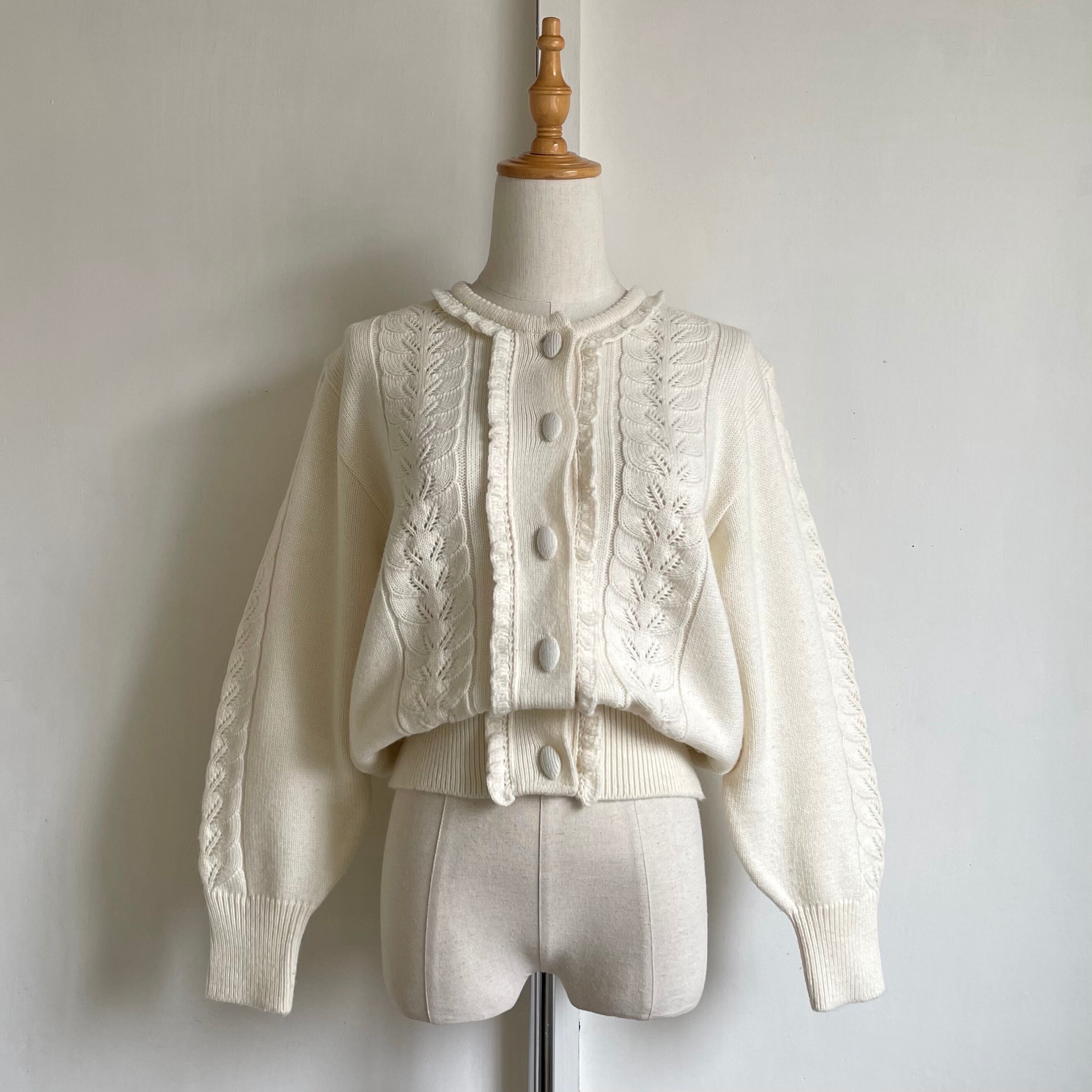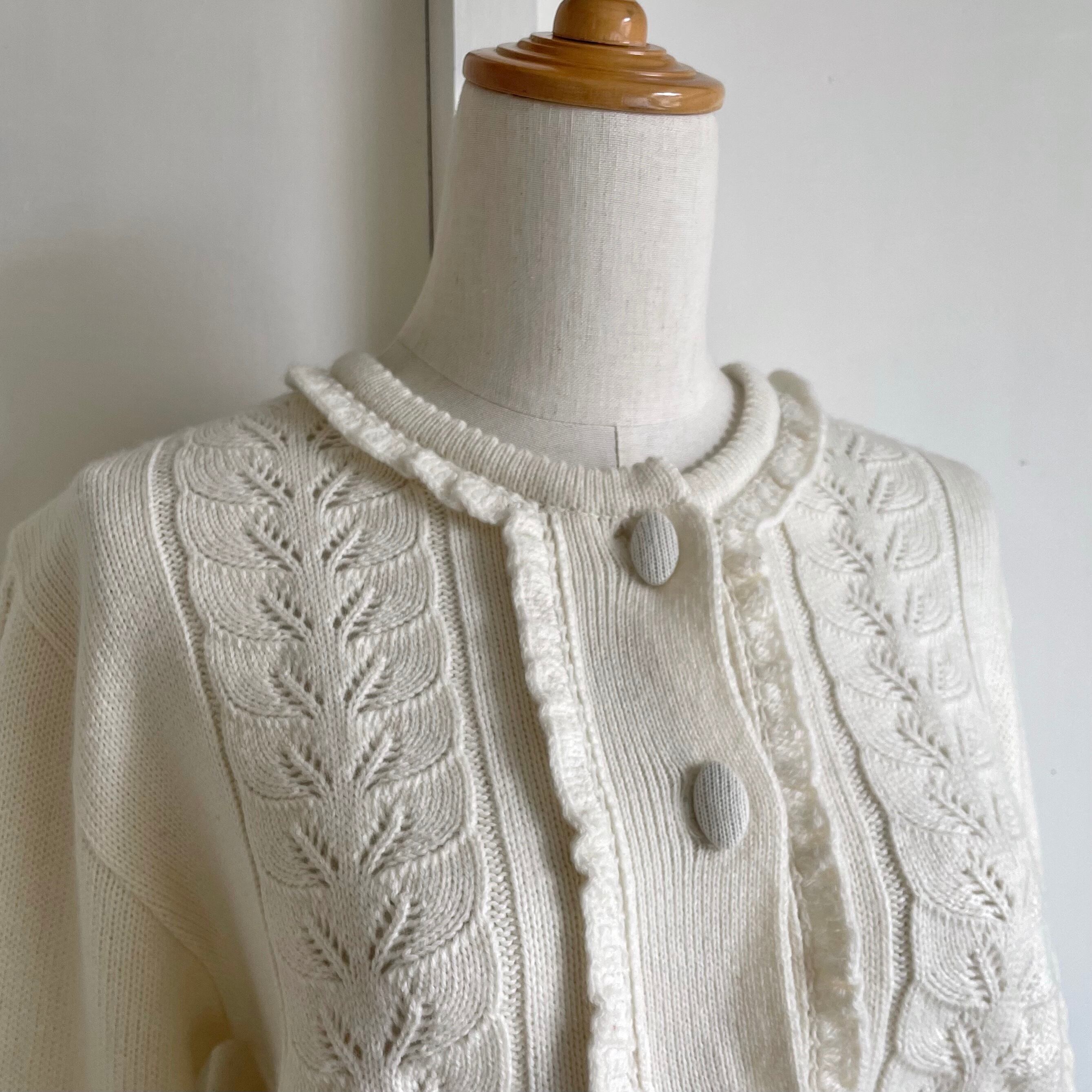 petite frill white cardigan 〈レトロ古着 プチフリル ホワイト カーディガン 白 ニット〉
