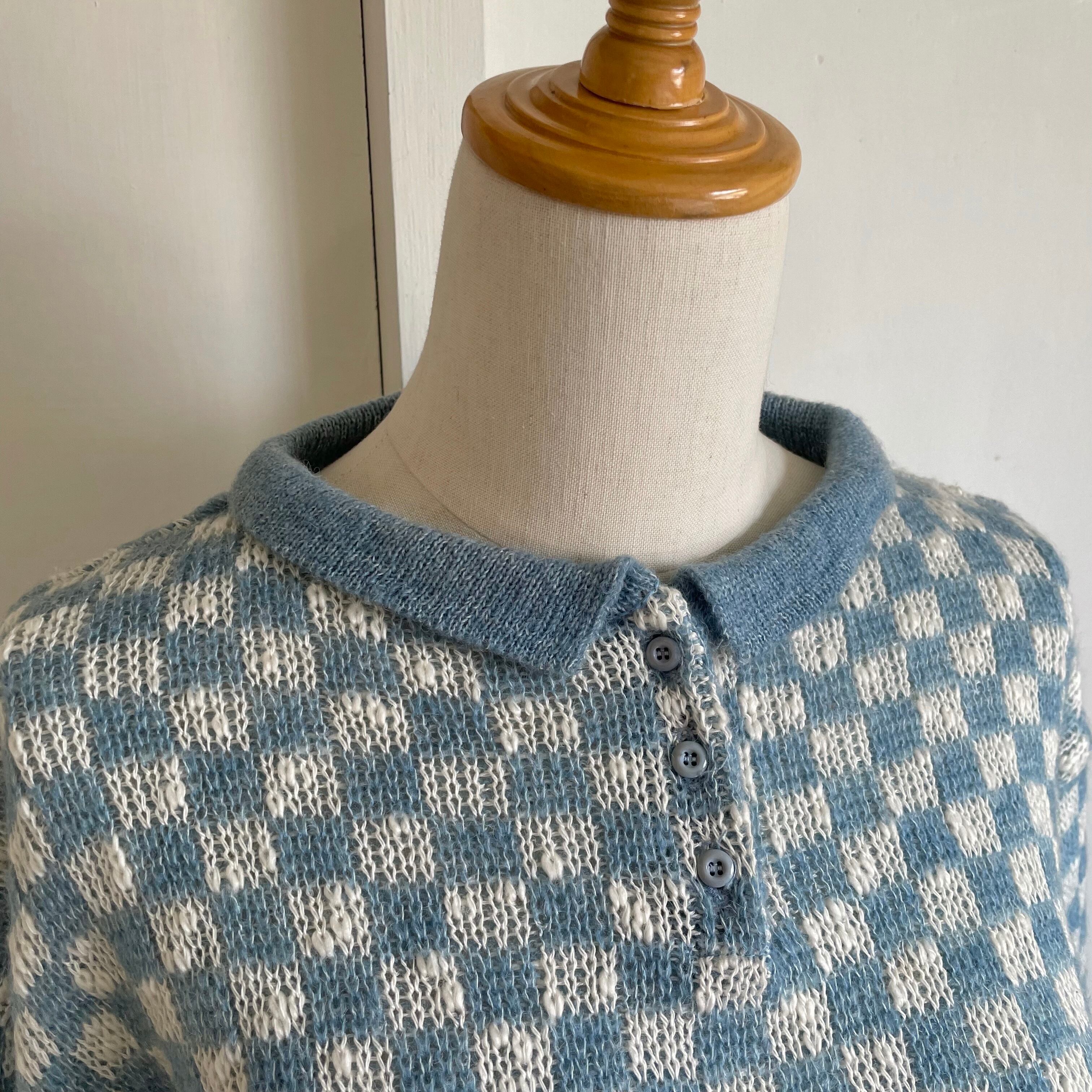 水色とホワイトのブロックチェックが可愛いポロニット