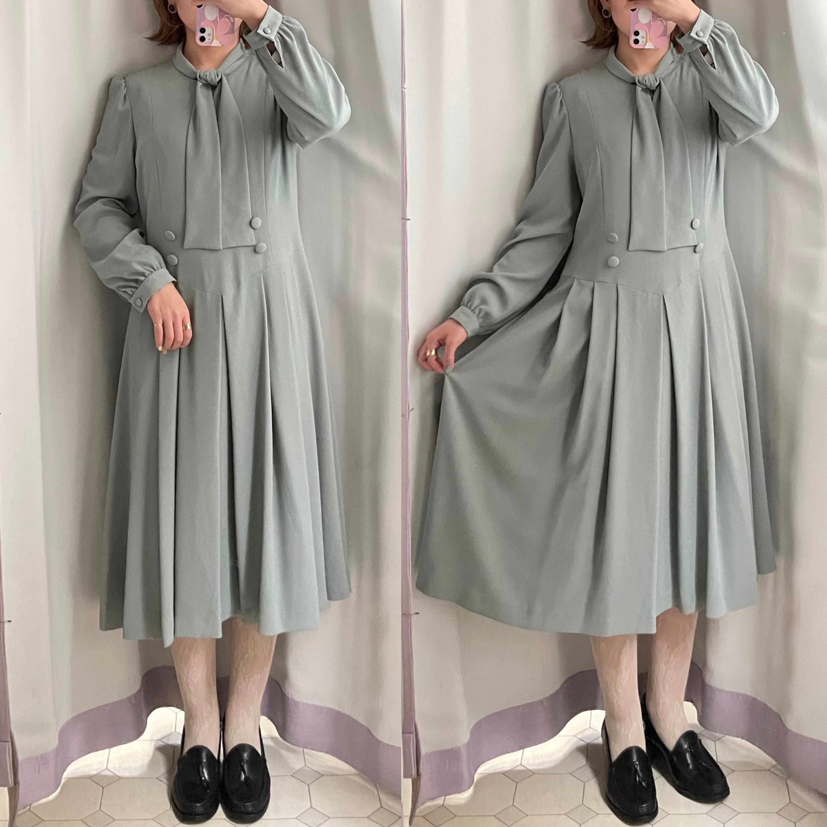 grayish light blue bowtie dress〈レトロ古着 グレイッシュ ライトブルー ボウタイワンピース〉
