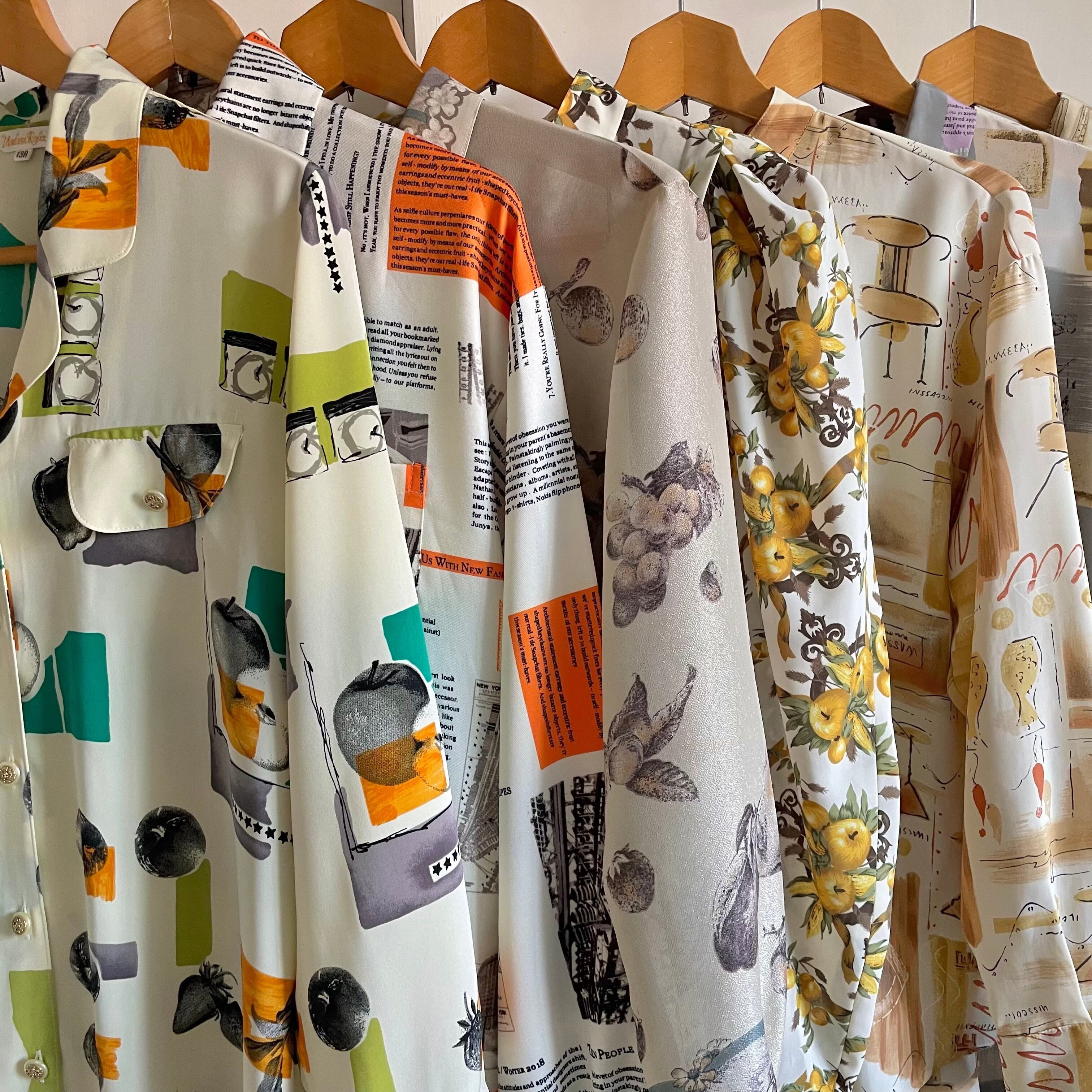 various motifs print band collar shirt 〈レトロ古着 バリアスモチーフ柄 バンドカラーシャツ オレンジ〉