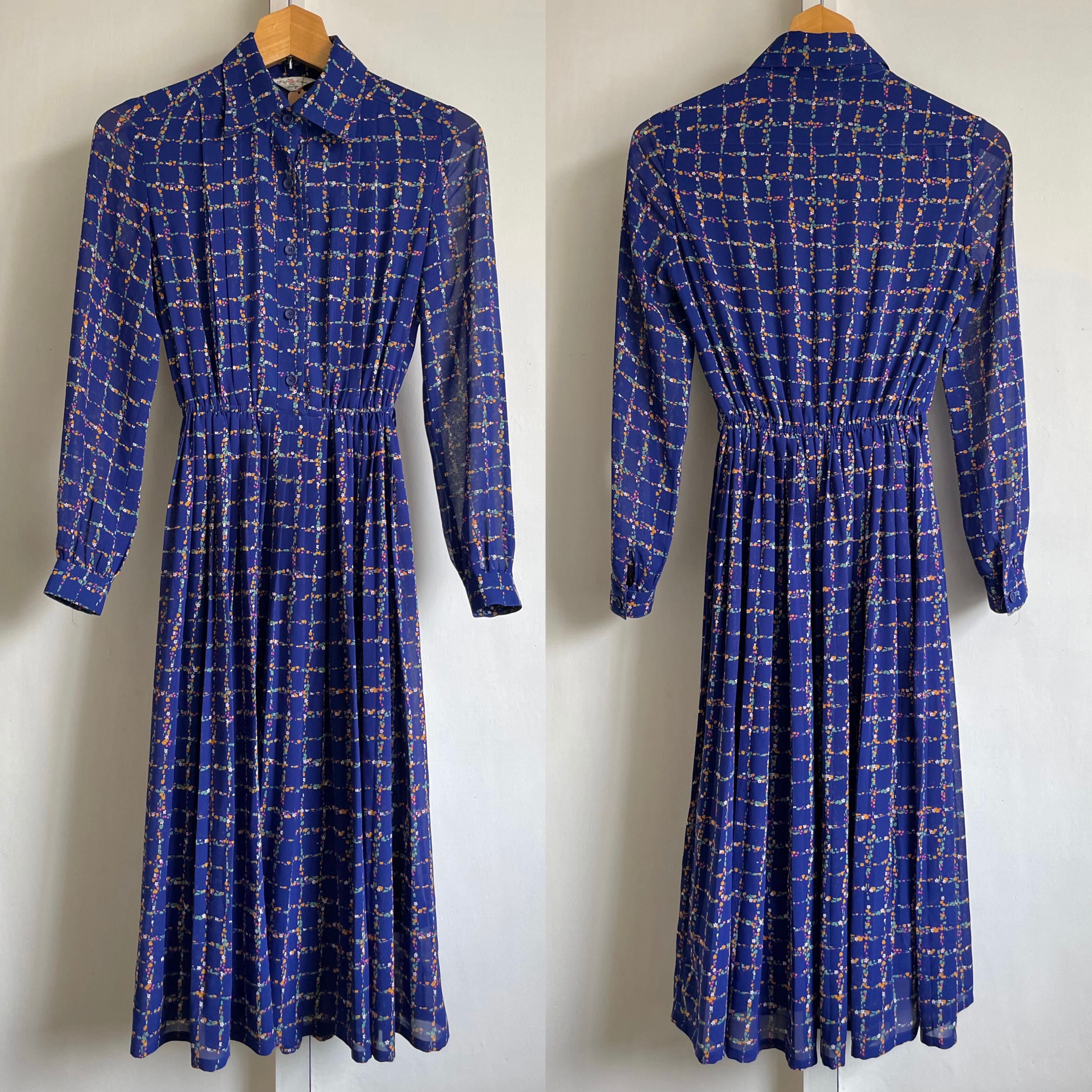 flower plaid pleated dress〈レトロ古着 フラワープレイド プリーツ ワンピース 紺〉