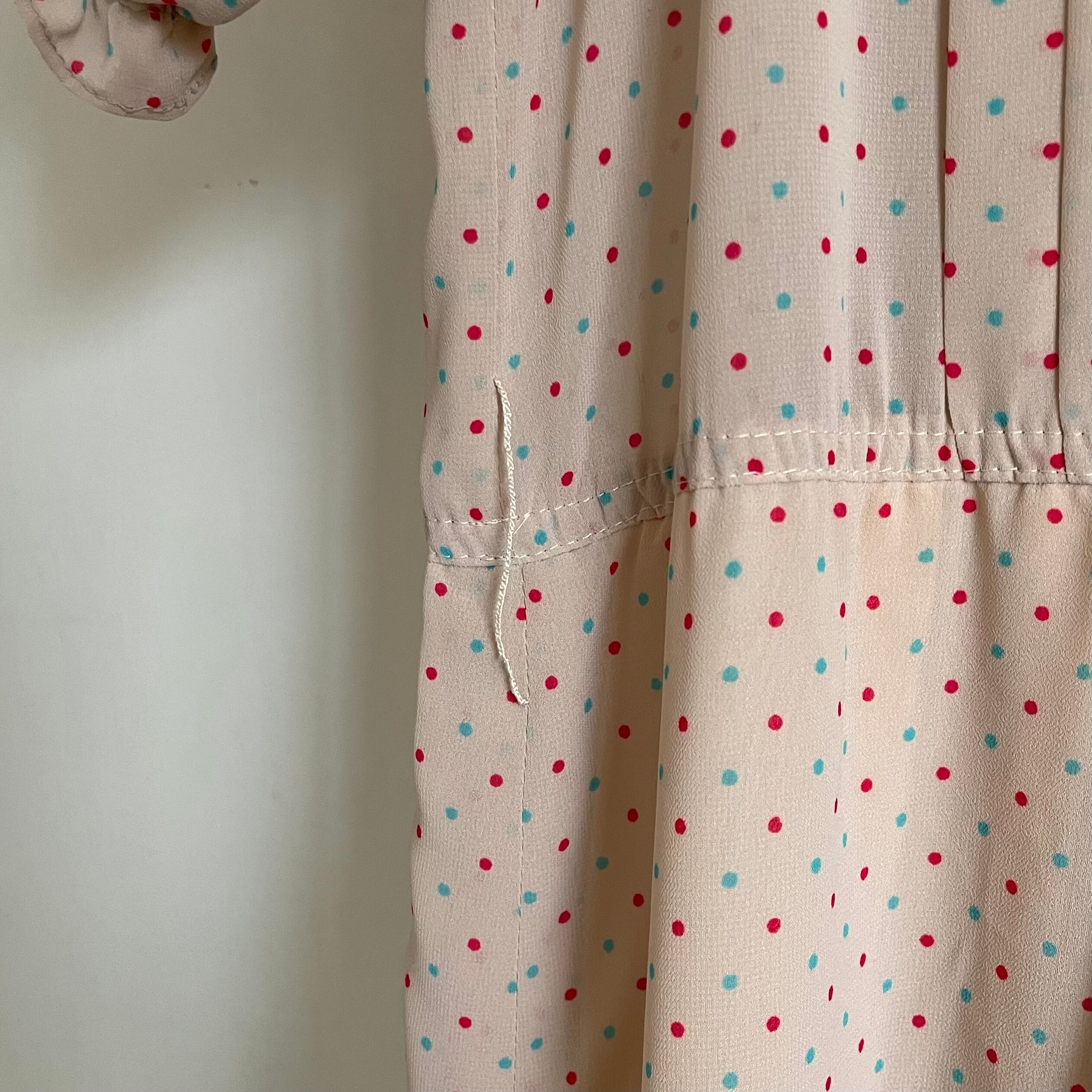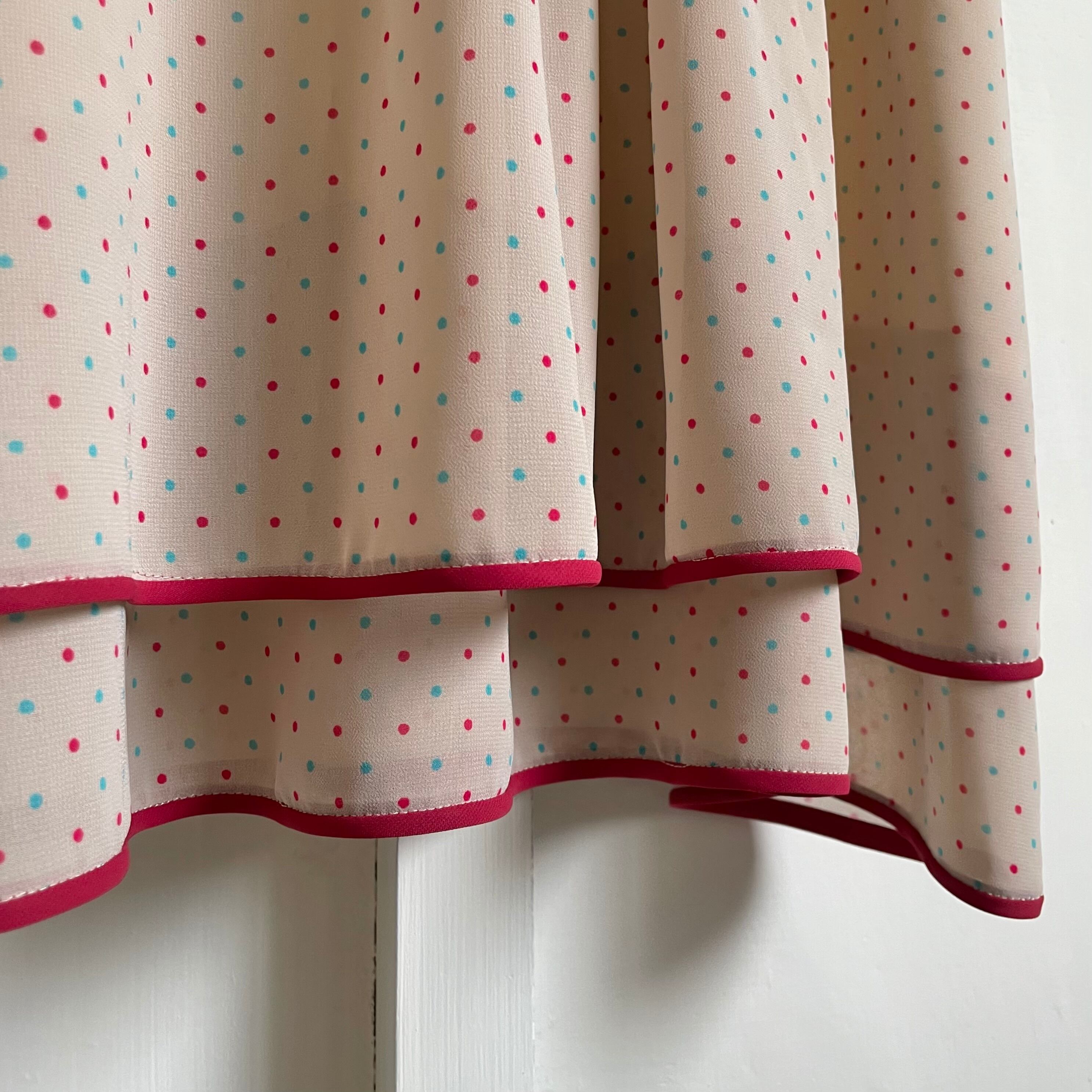 ベージュ地に赤と水色のドット柄がレトロなワンピース
