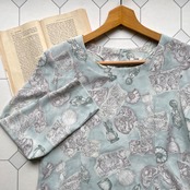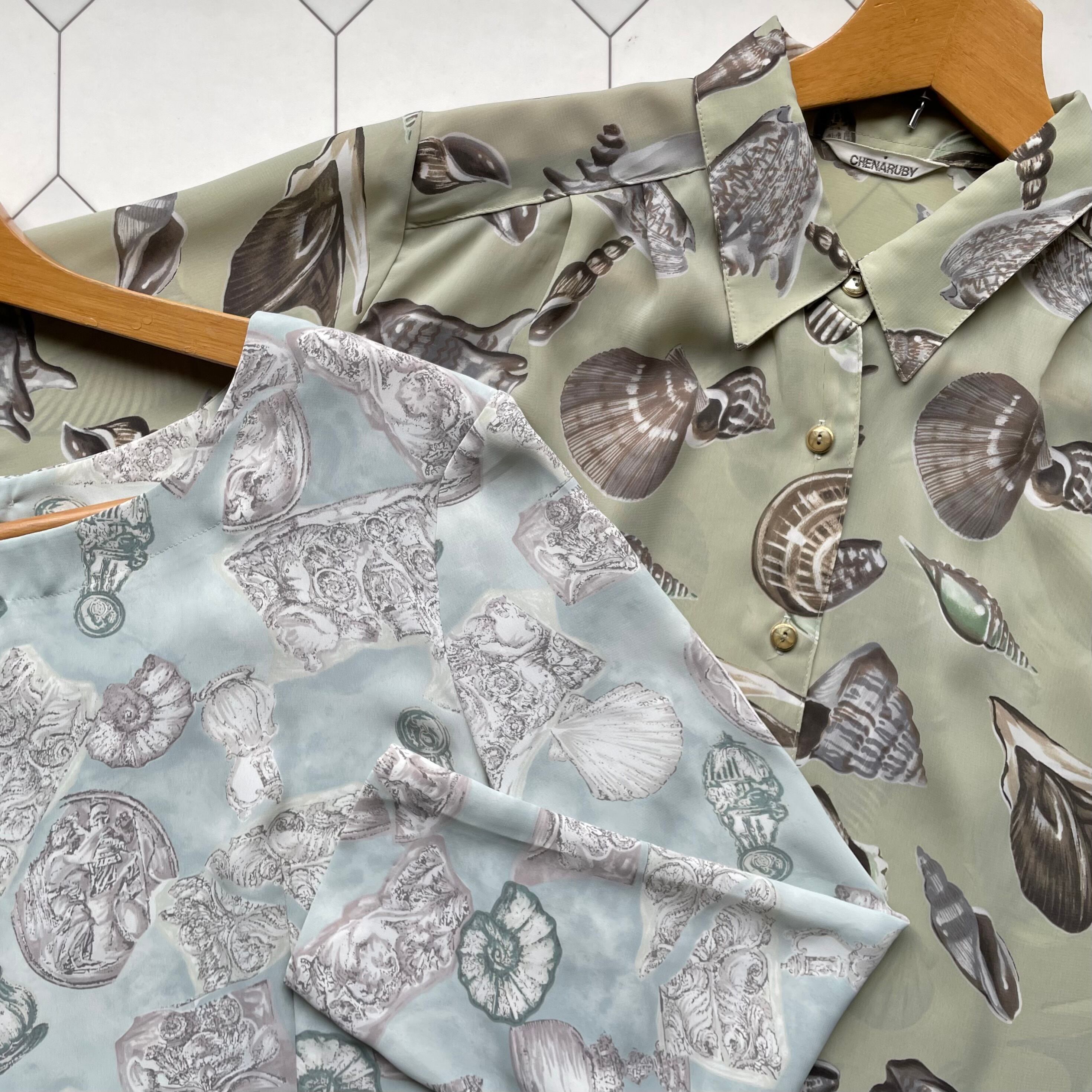 淡いブルーにシェル柄が爽やかなブラウス