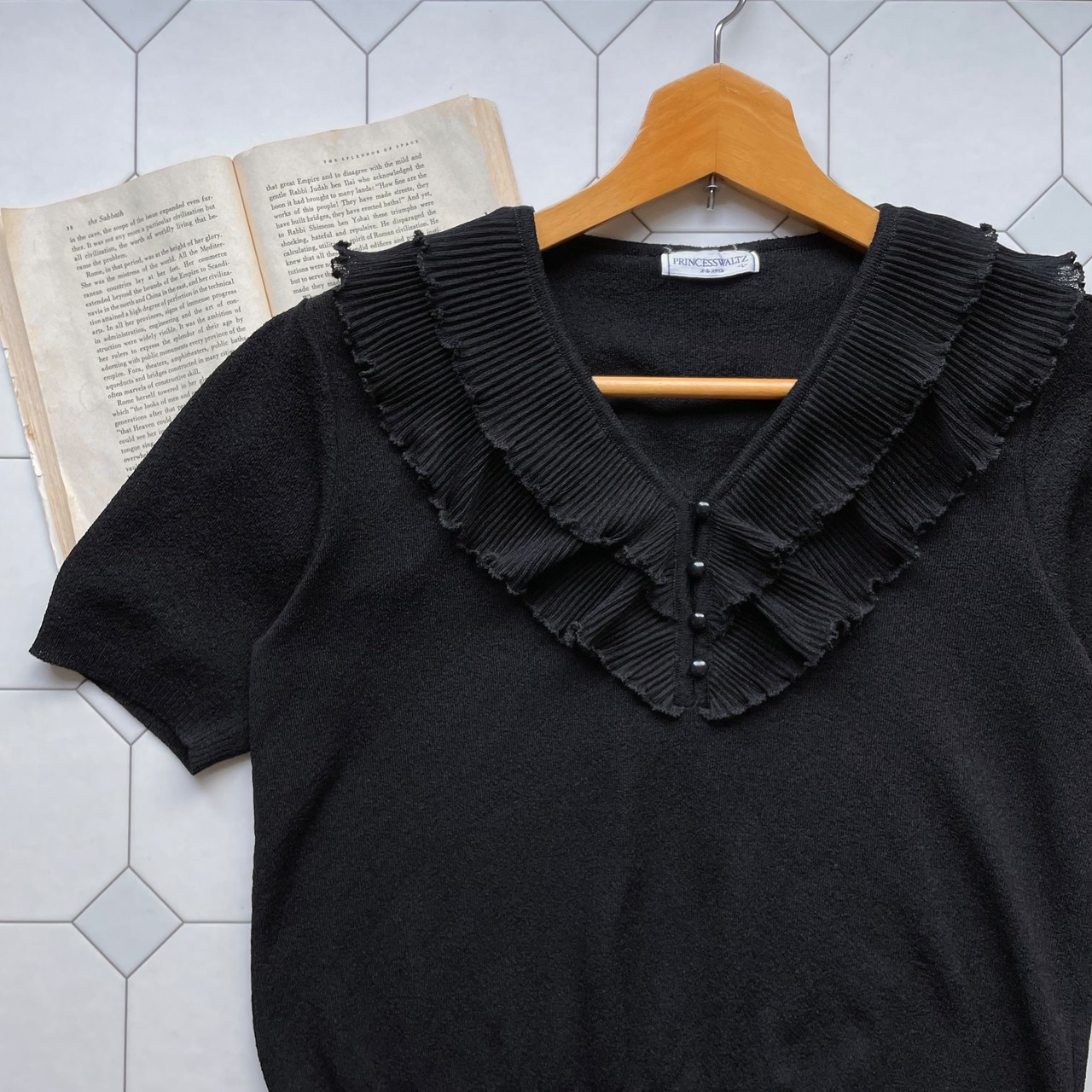 pleated frill black summer knit 〈レトロ古着 プリーツフリル ブラック サマーニット 黒〉