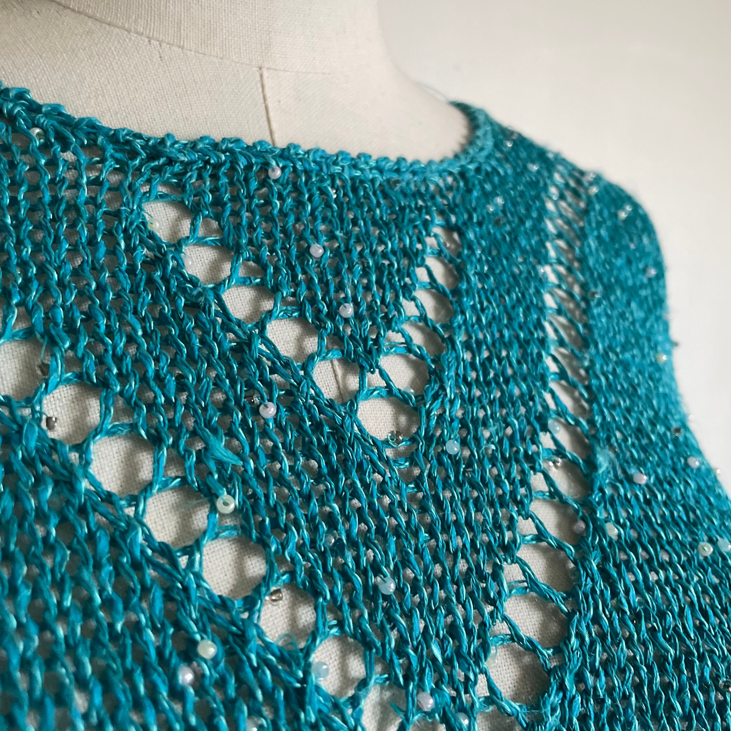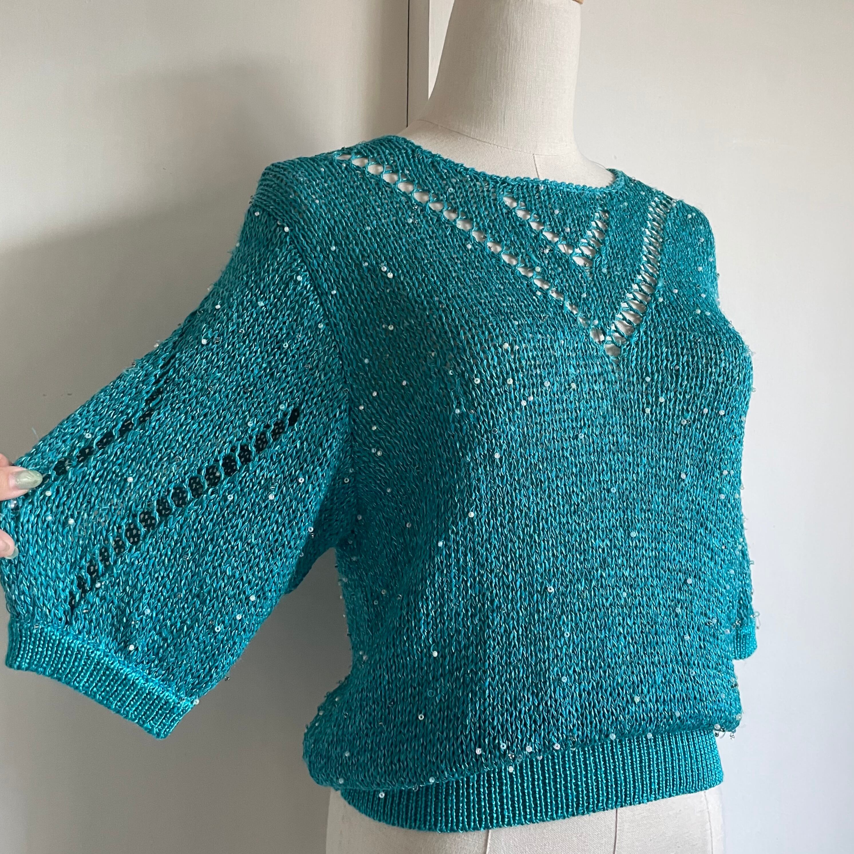 bead yarn turquoise blue summer knit 〈レトロ古着 ビーズヤーン ターコイズブルー サマーニット 日本製 〉