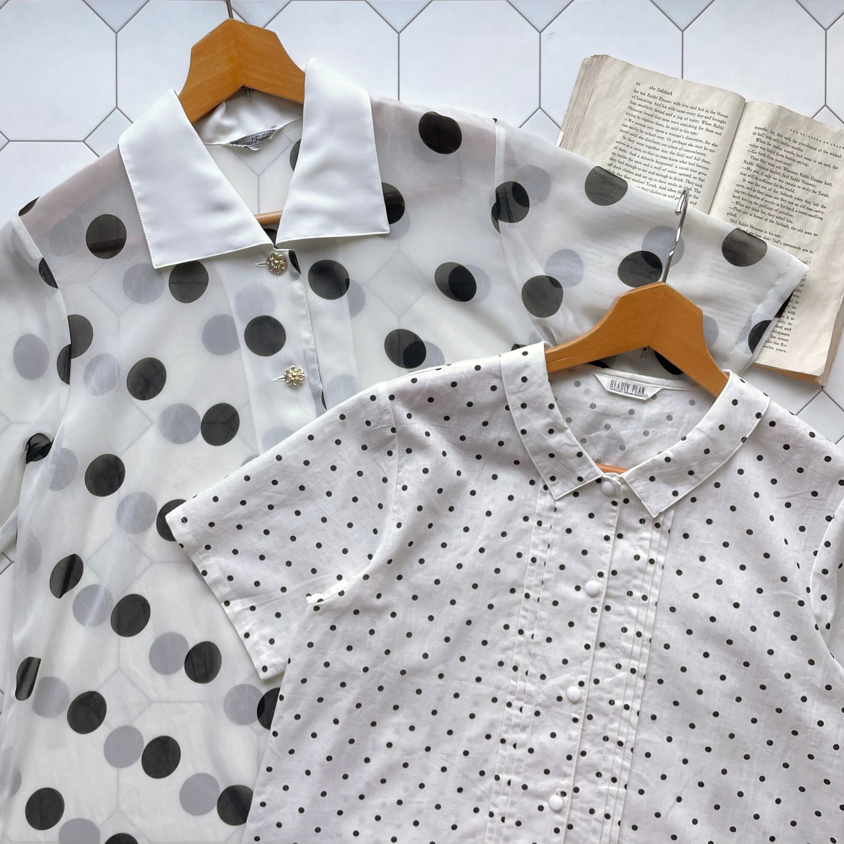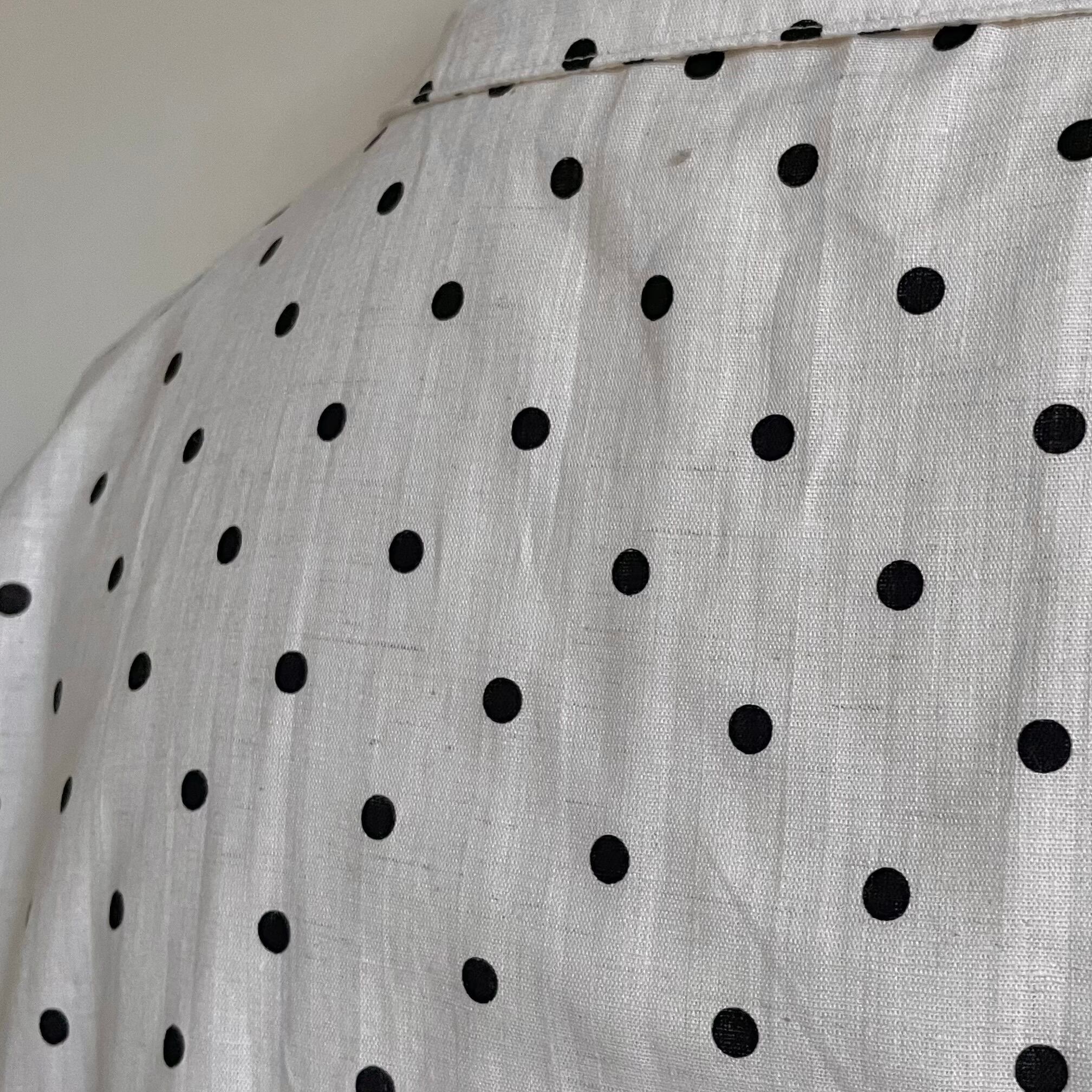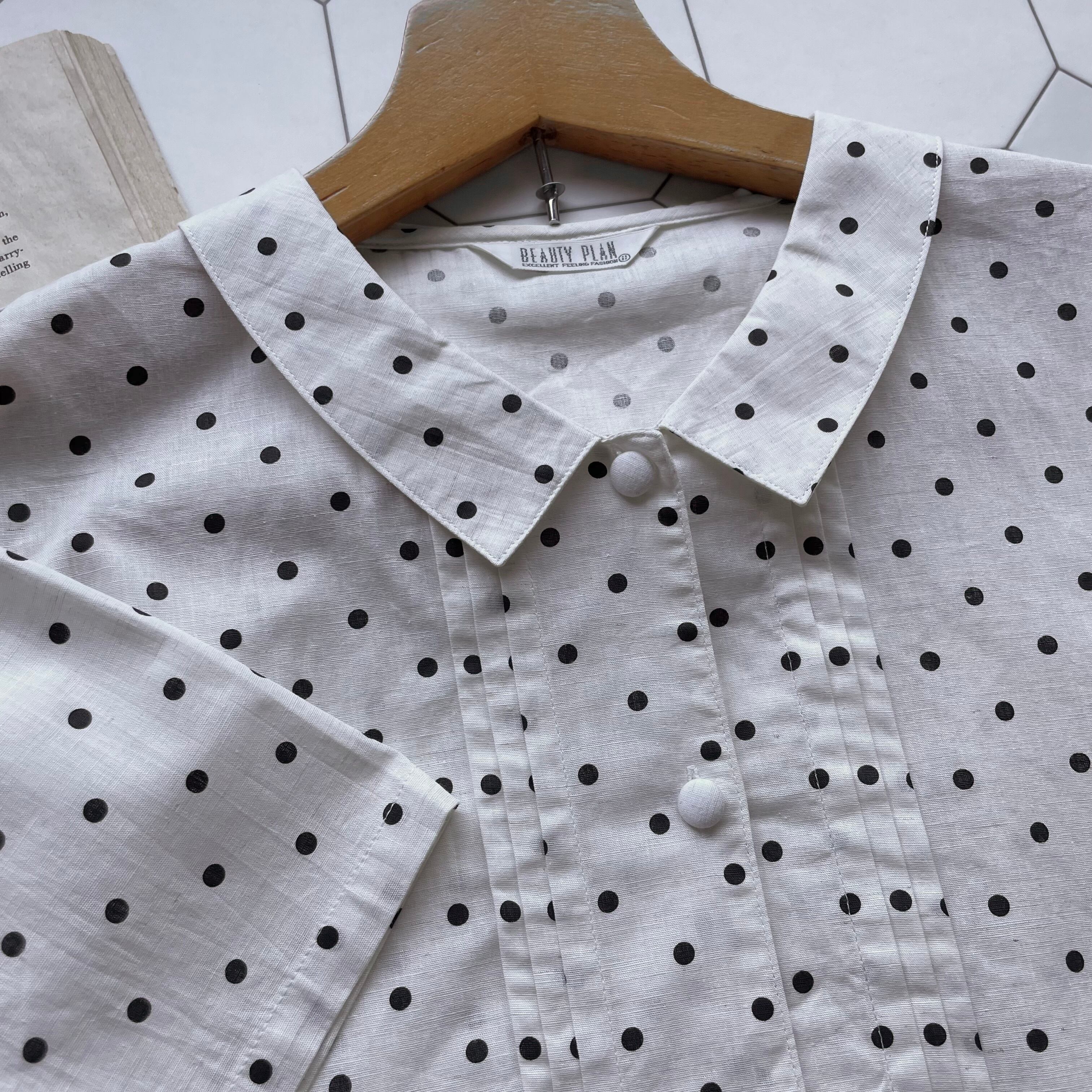 白地に黒のポルカドットが爽やかなブラウス