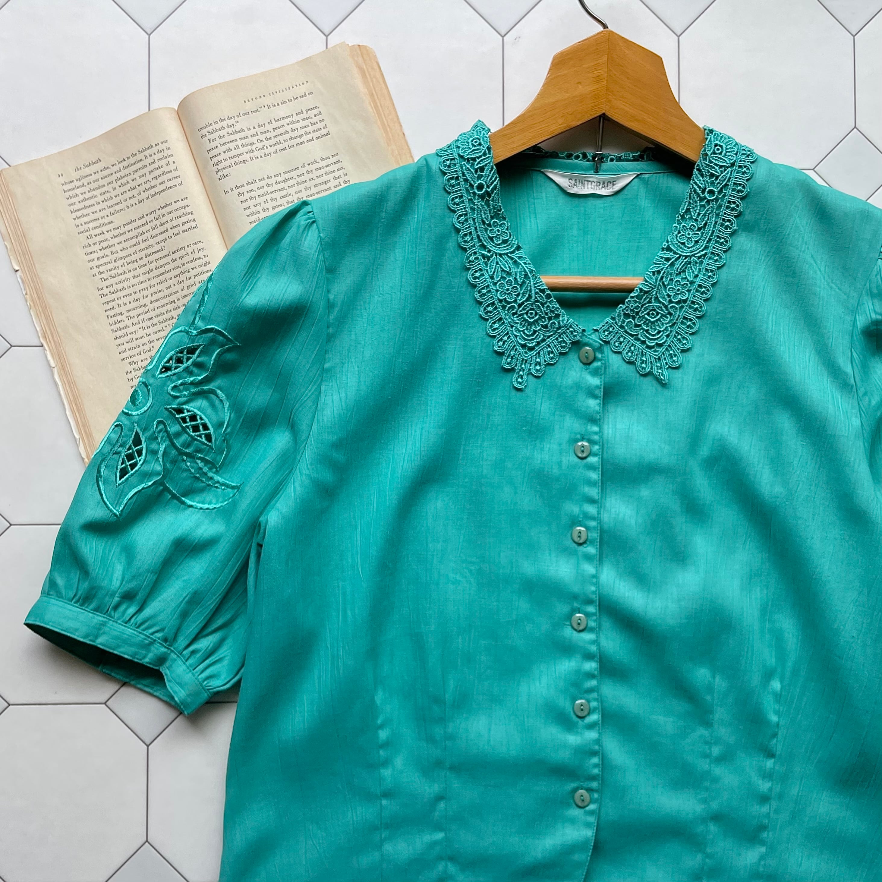 lace collar & embroidered sleeves mint green blouse〈レトロ古着 レース襟 & 刺繍袖 ミントグリーン ブラウス〉