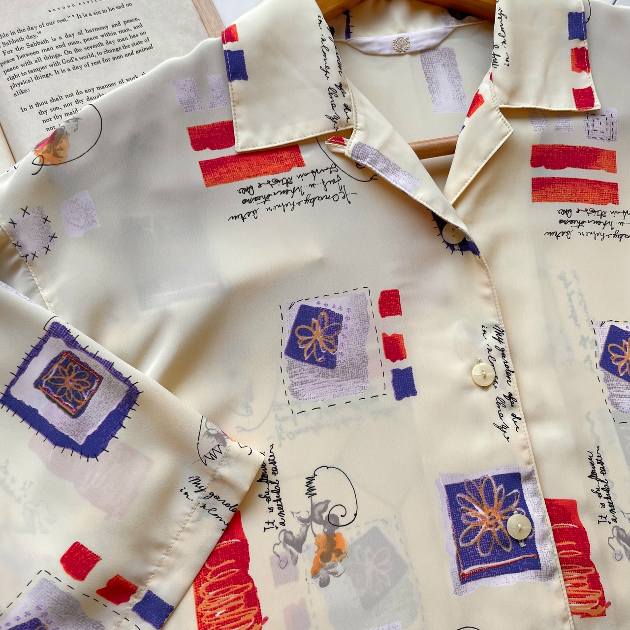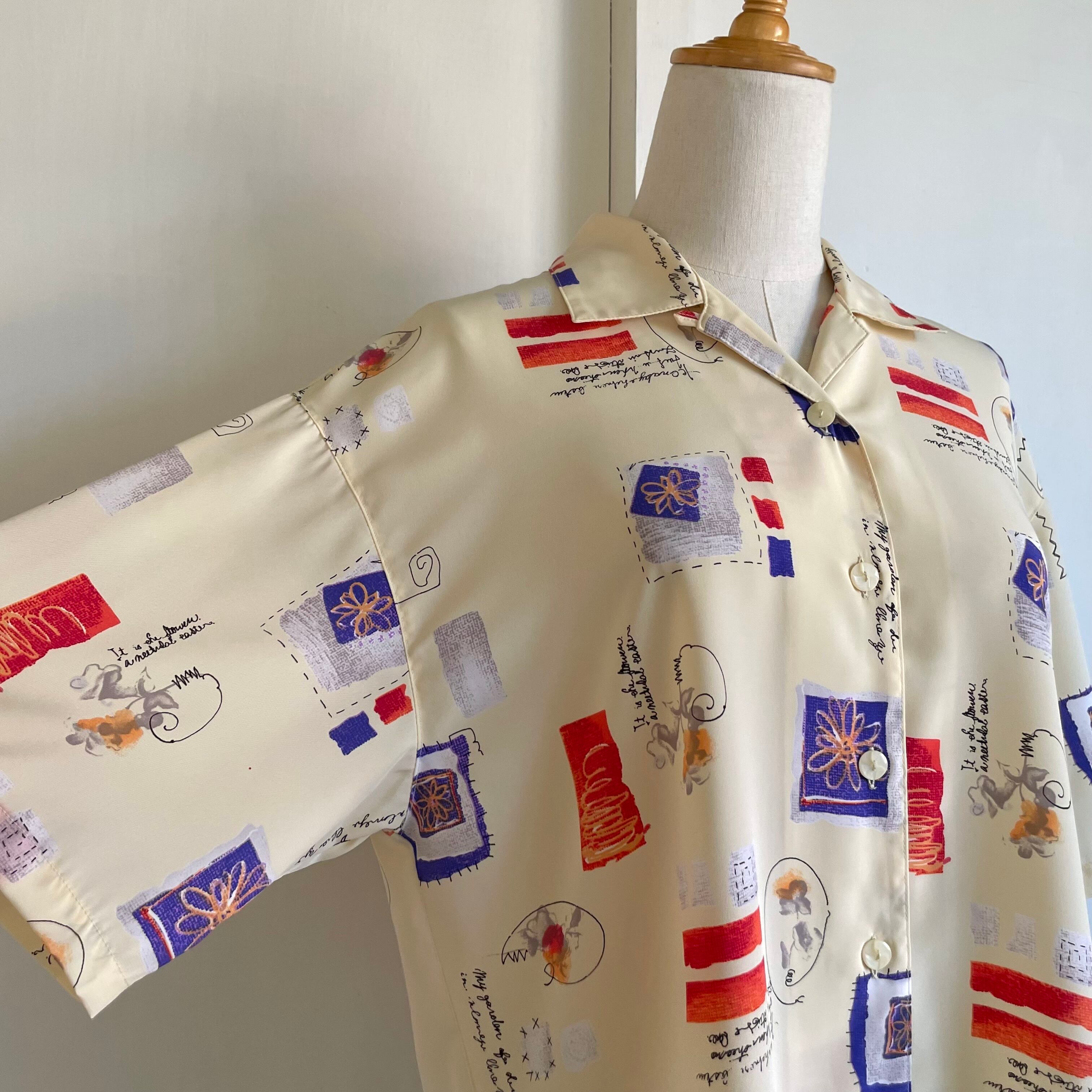 flower & message motif shirt〈レトロ古着 フラワー&メッセージ モチーフ 柄シャツ 日本製〉