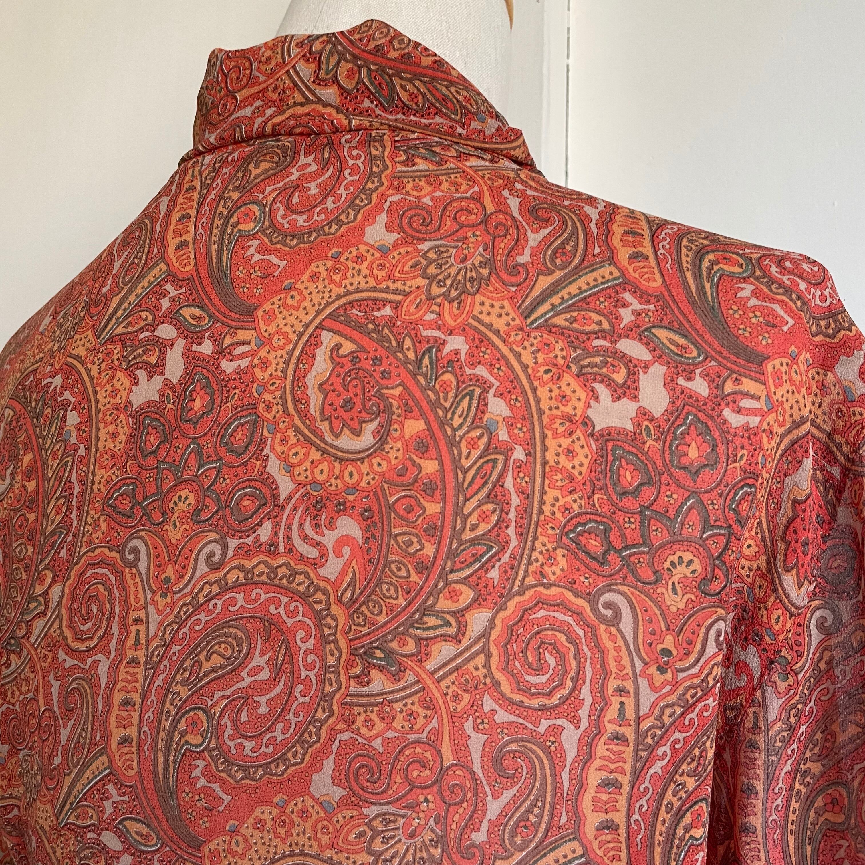 オレンジを基調としたペイズリー柄のボウタイブラウス
