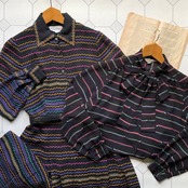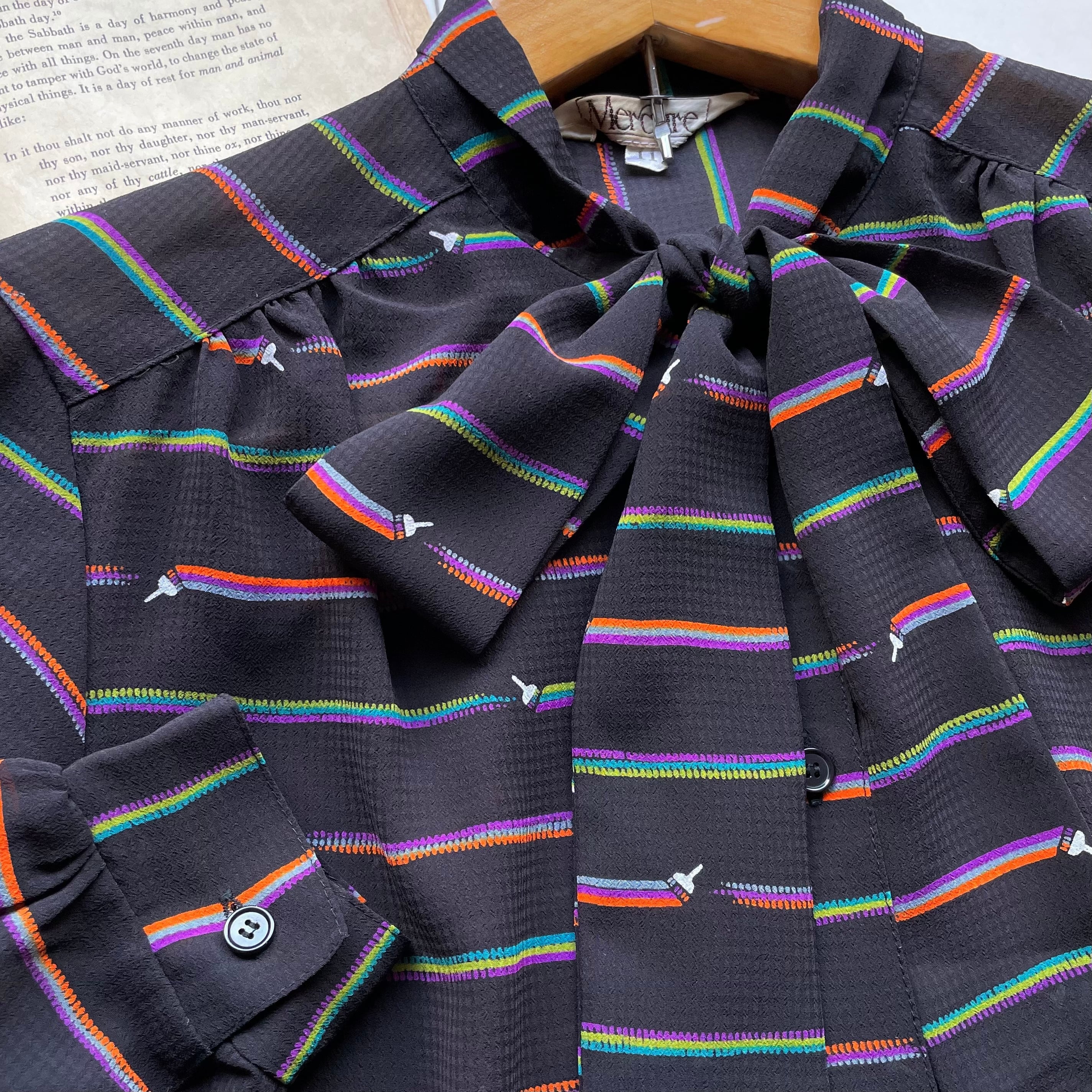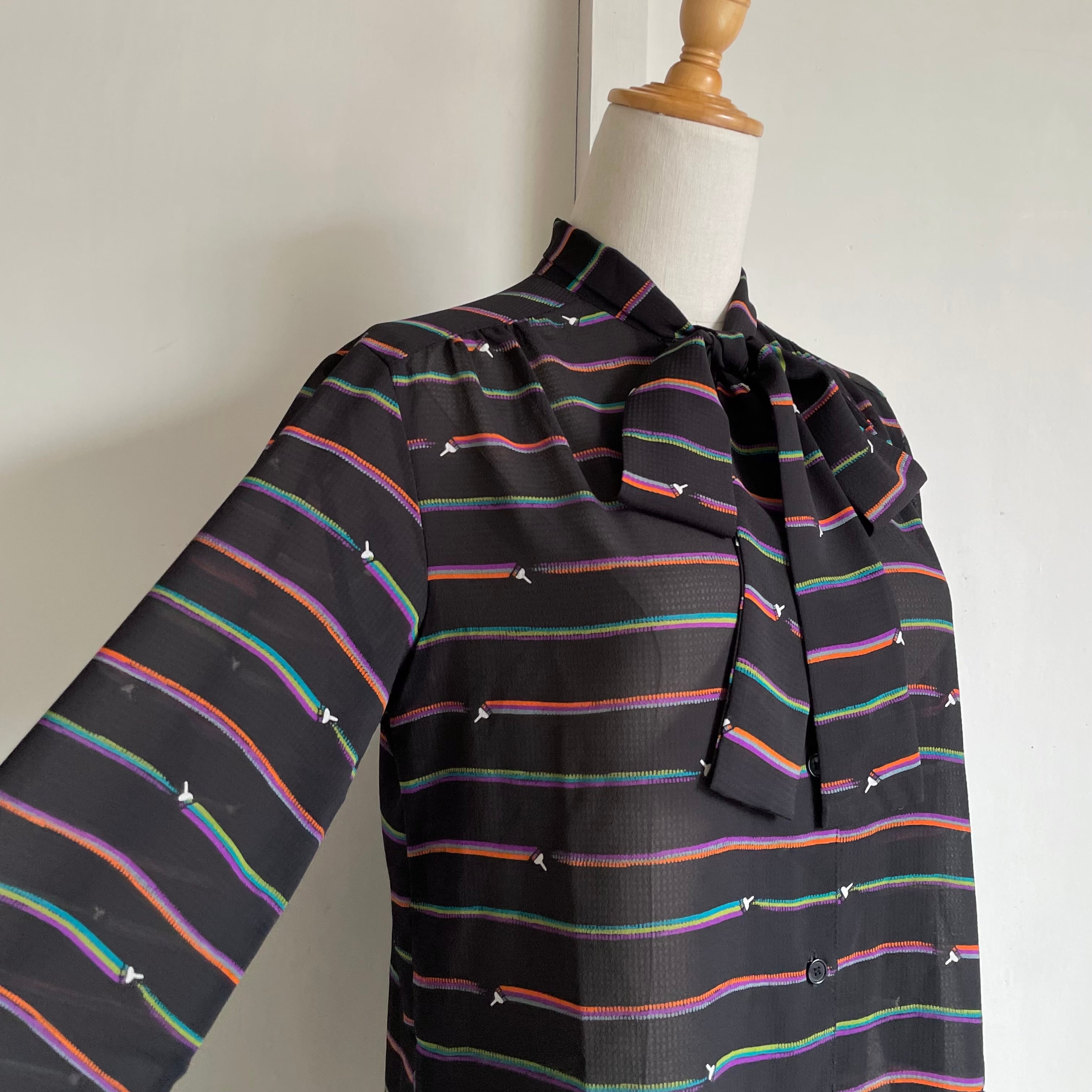 painting border bowtie blouse 〈レトロ古着 ペインティング ボーダー ボウタイブラウス 日本製 ジャパンヴィンテージ〉