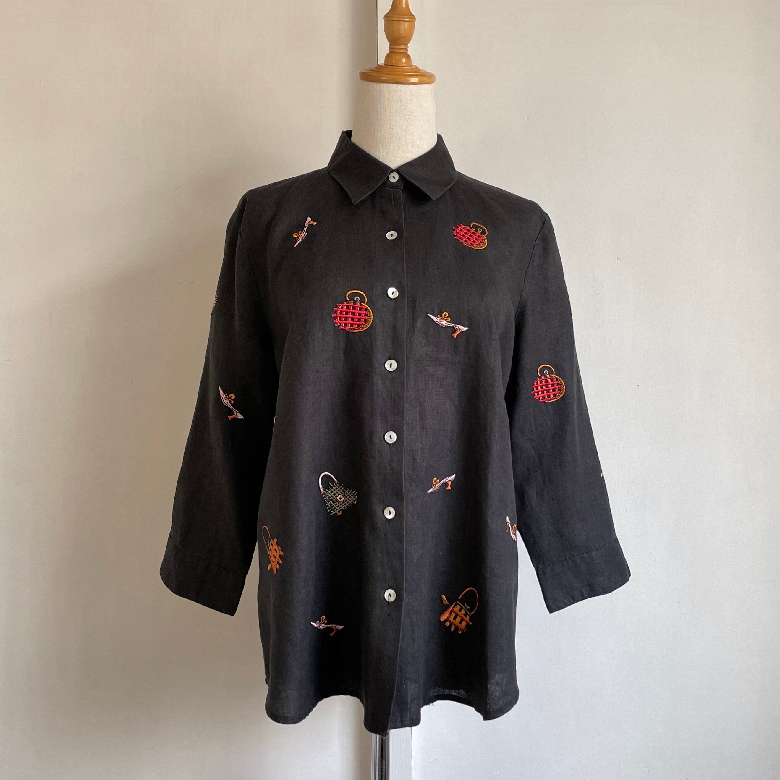 bags & mules embroidered linen shirt 〈レトロ古着 バッグ&ミュール 刺繍 リネンシャツ 黒〉